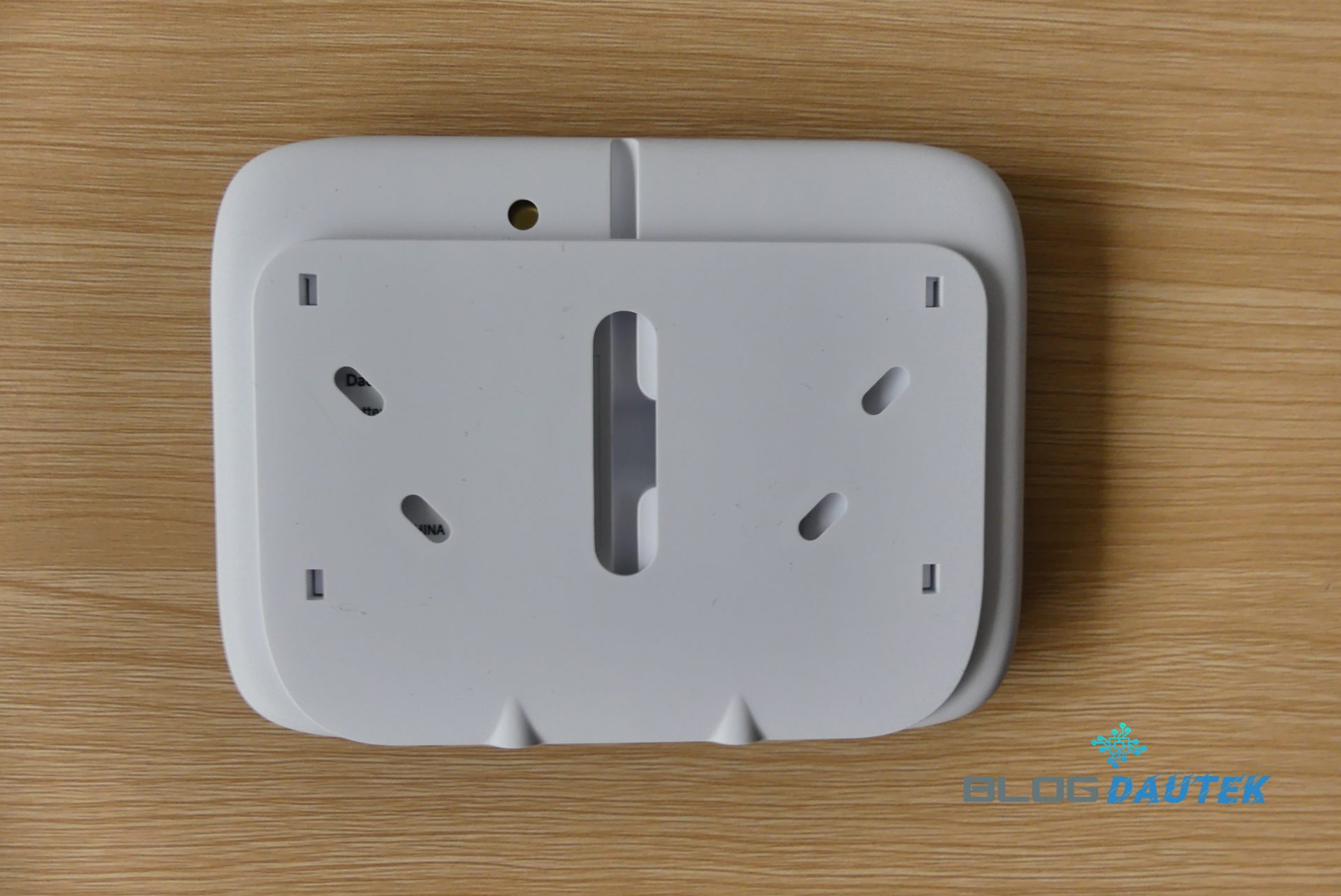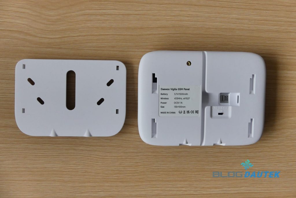 Face arrière, avec le support pour fixer au mur et en dessous l’emplacement pour le câble d’alimentation USB-C fourni ainsi que le bloc secteur. Une carte Nano SIM peut être insérer. La centrale peut également fonctionner sur batterie pendant environ 4h.
