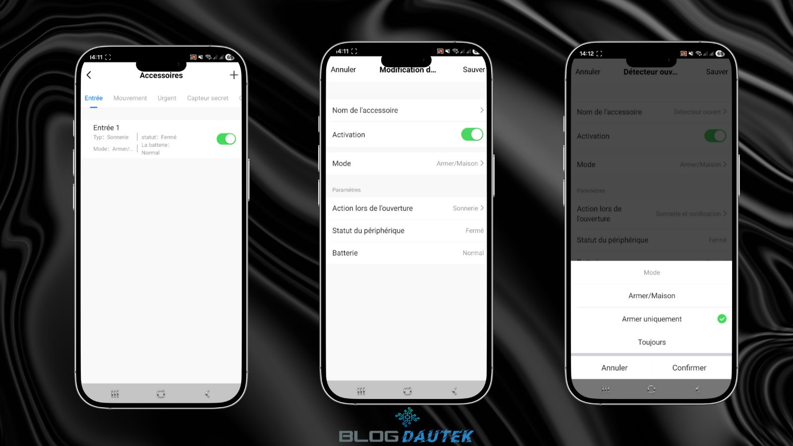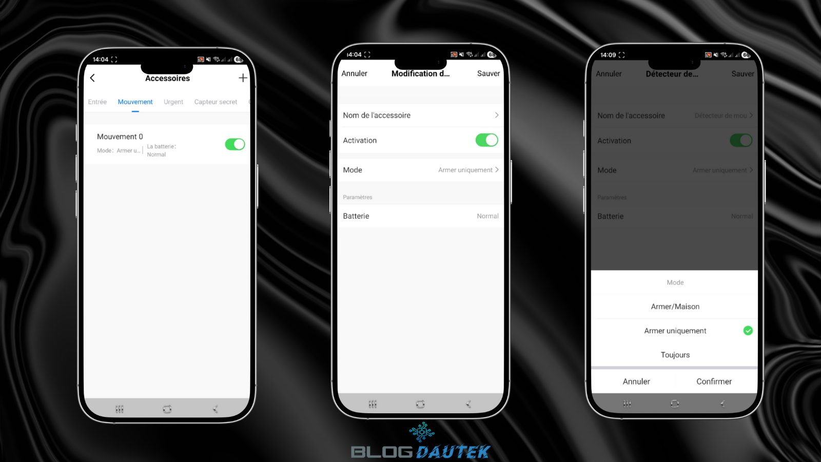 Vous pouvez activer ou désactiver le détecteur facilement avec le bouton. Vous pouvez changer le nom et sélectionnez le mode de protection que vous voulez pour déclencher l’alarme. moi je choisis Armer uniquement.