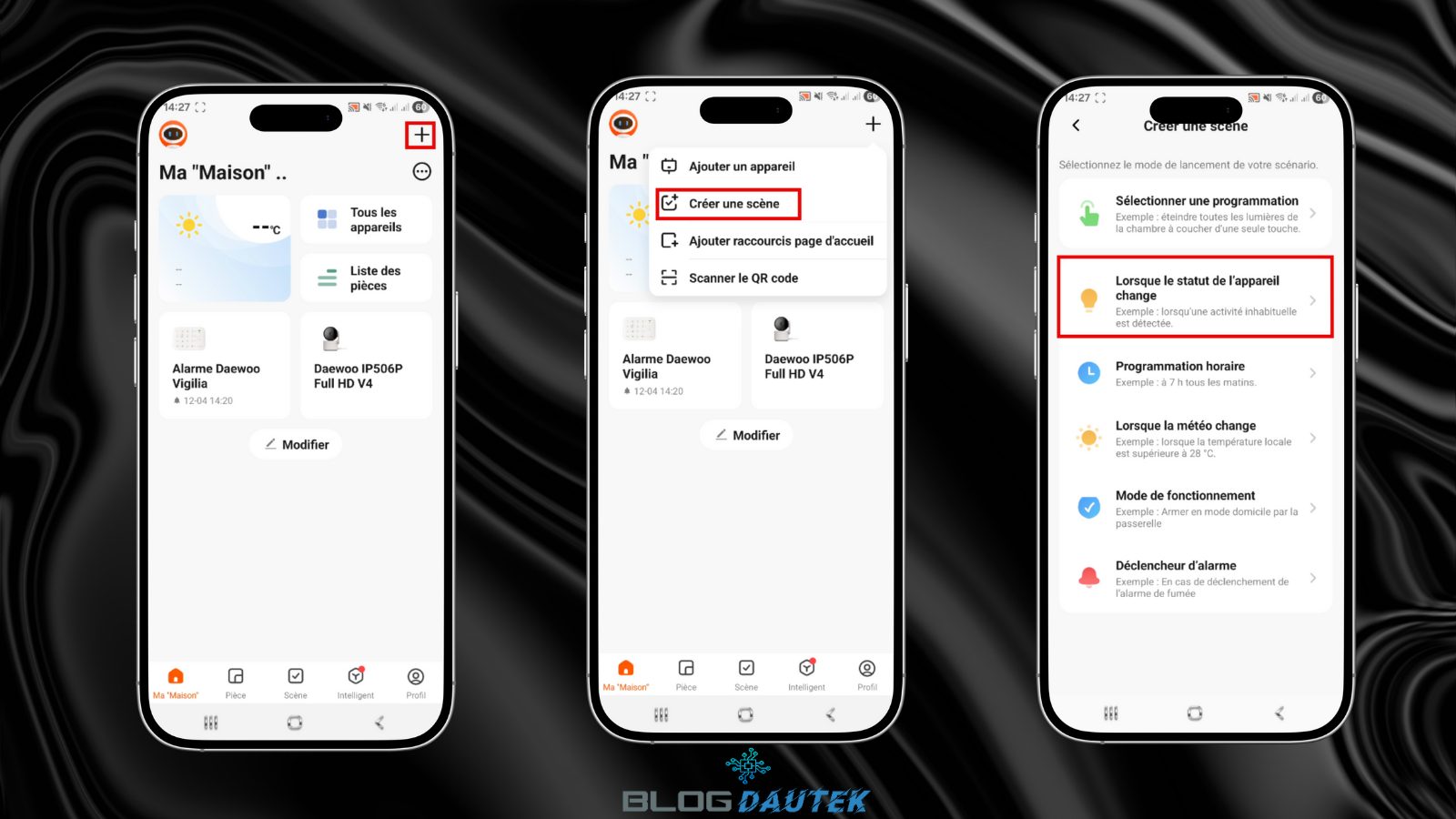 Pour finir, nous allons faire un scénario pour déclencher l’alarme Daewoo avec une détection de la caméra. Bien sûr d’autres scénarios sont possible, celui ci est juste un exemple. Pour dela, cliquez sur + puis sur Créer une scène puis lorsque le statut change.