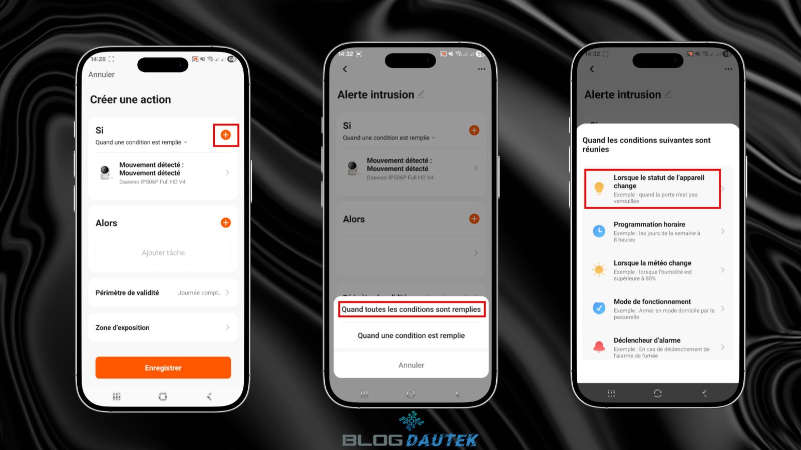 Il faut ajouter une autre condition, car si on laisse comme ça, l’alarme se déclenchera même quand on passe devant en se déplaàant dans la maison. Donc cliquez sur le + cliquez sur Quand toutes les conditions sont remplies et cliquez sur Lorsque le statut de l’appareil change.