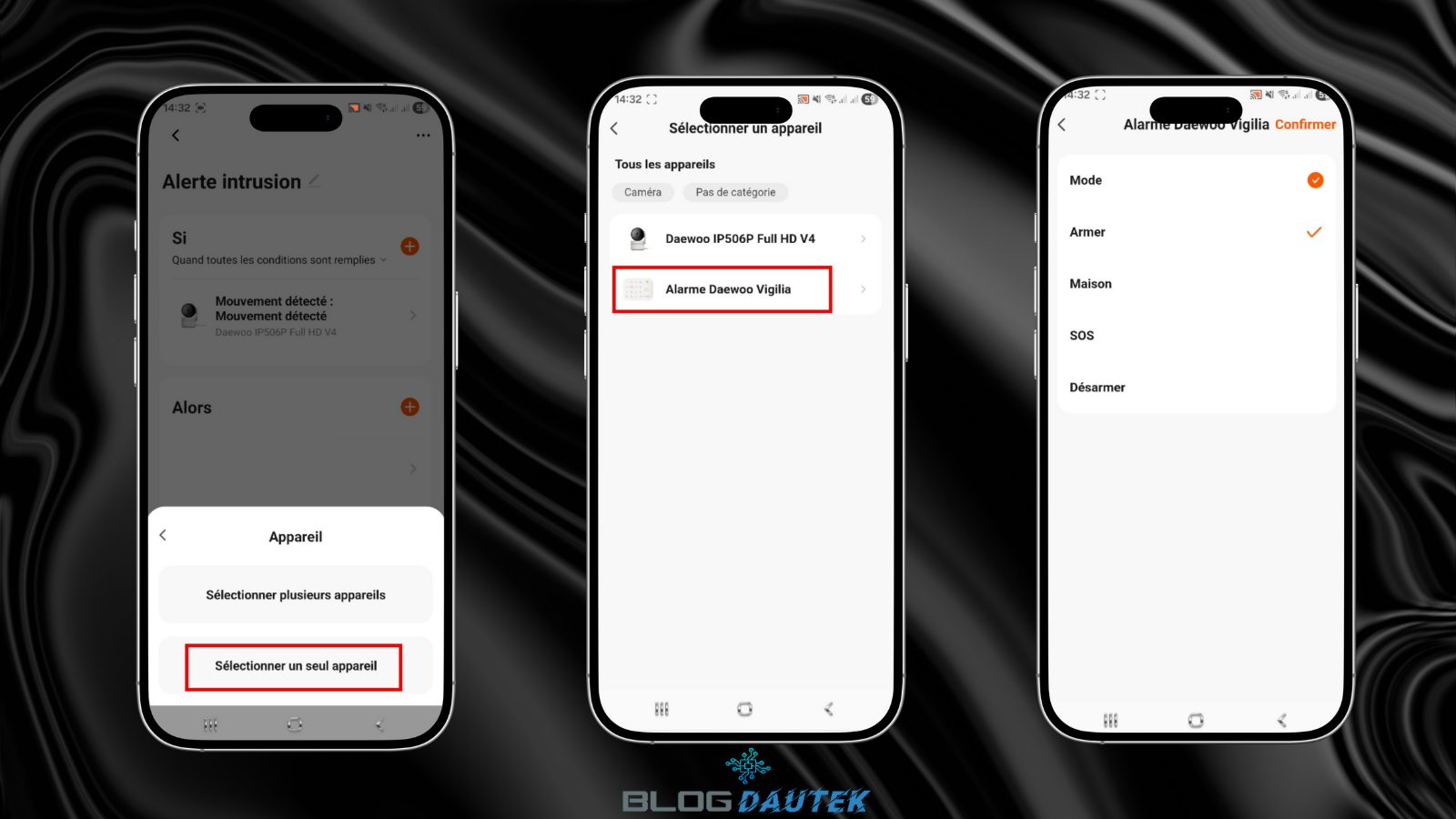 Puis, cliquez sur sélectionner un seul appareil puis sur l’alarme Vigilia. Cliquez sur mode Armer et cliquez sur Confirmer.