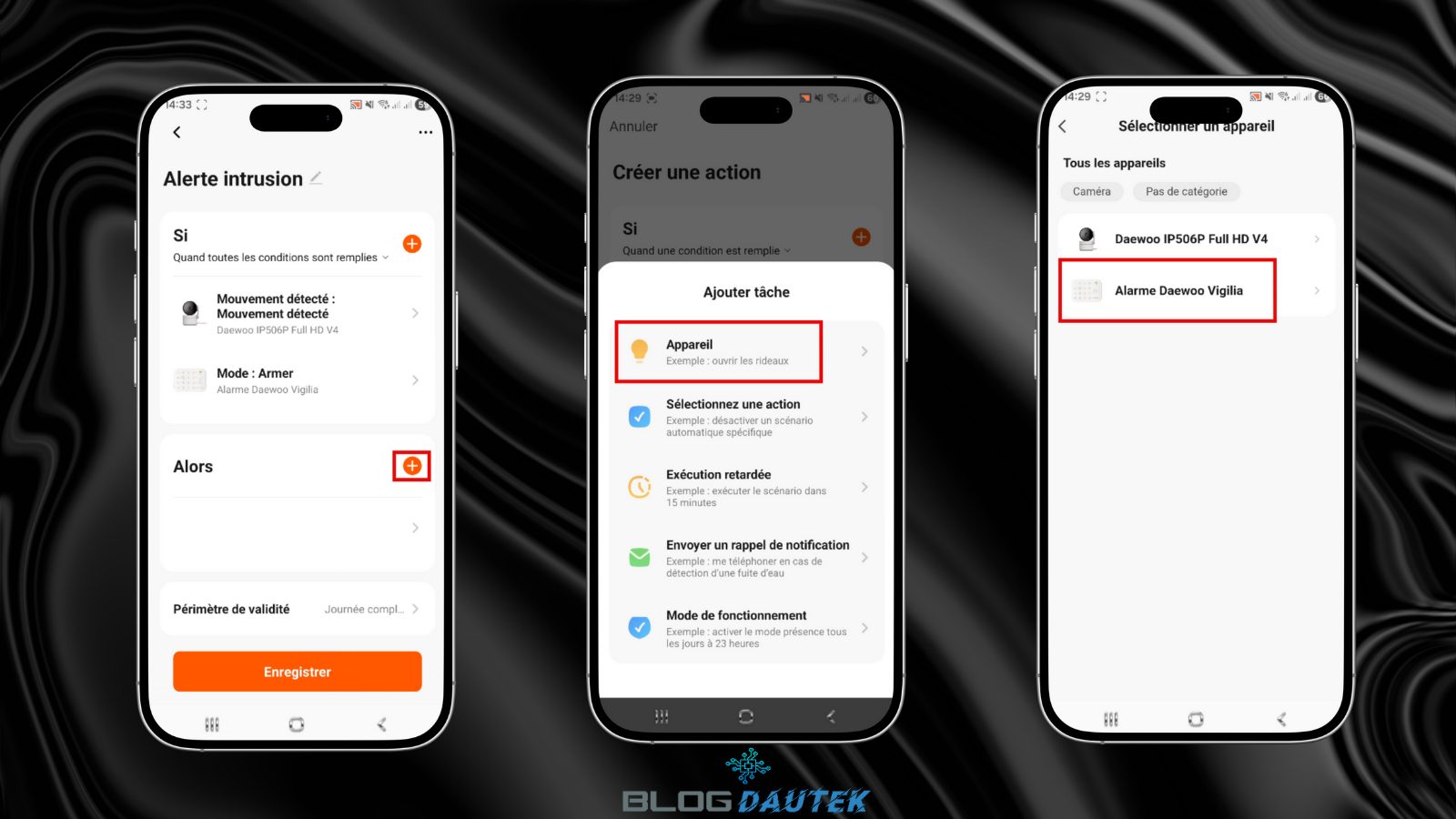 Dans Alors, cliquez sur le + poeuis sur Appareil puis sélectionnez l’alarme.