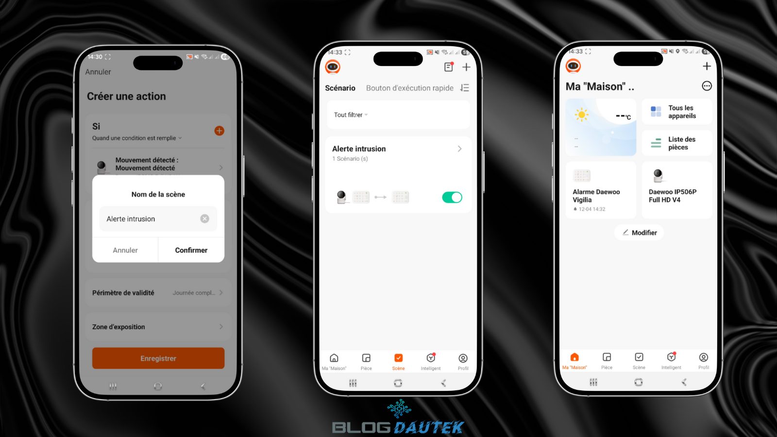Cliquez sur Confirmer. Vous voyez dans l’onglet scène, vous pouvez l’activer ou désactiver. Maintenant, à chaque fois que vous êtes absent et que l’alarme est armée, alors elle se déclenchera si quelqu’un passe devant.