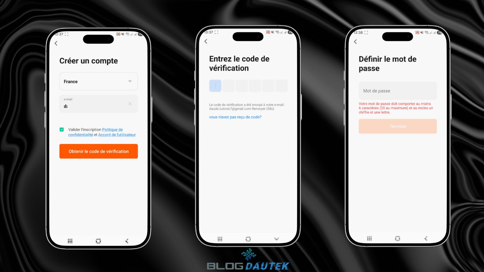 Ensuite, mettez votre adresse mail puis saisir le code reçu par mail. Mettez un mot de passe.