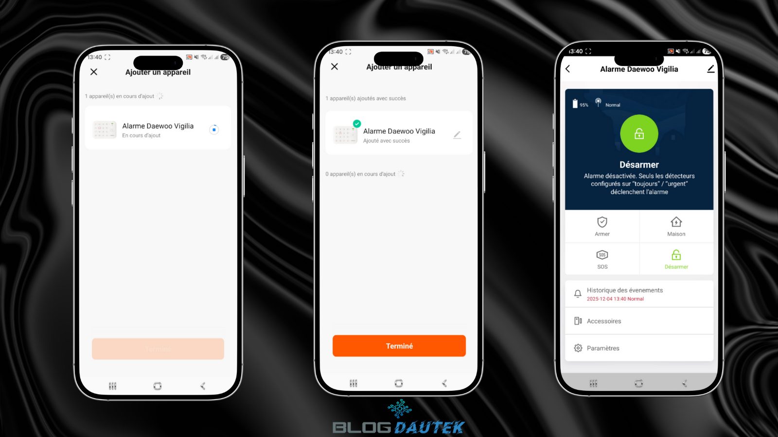 Elle va s’intégrer et cliquez sur Terminé. Vous avez quatre modes différents, Désarmer, Maison, SOS et Armer.