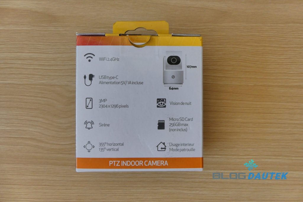 La caméra est fournie avec notice, cordon USB et bloc secteur, support mural et vis de fixation.