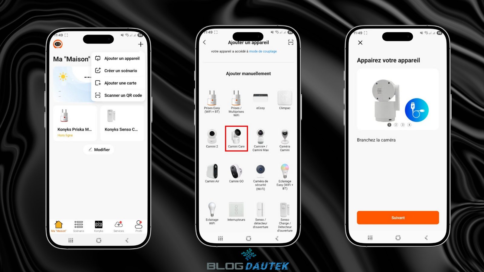 Commencez par ouvrir l’application Konyks et cliquez sur le + et Ajouter un appareil. Cliquez sur Camino Care et suivez les 4 étapes.