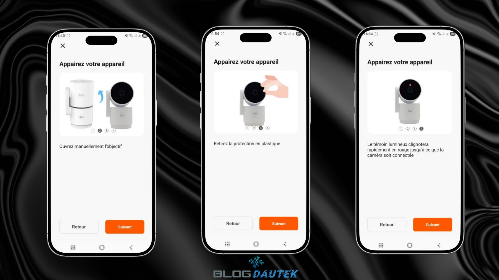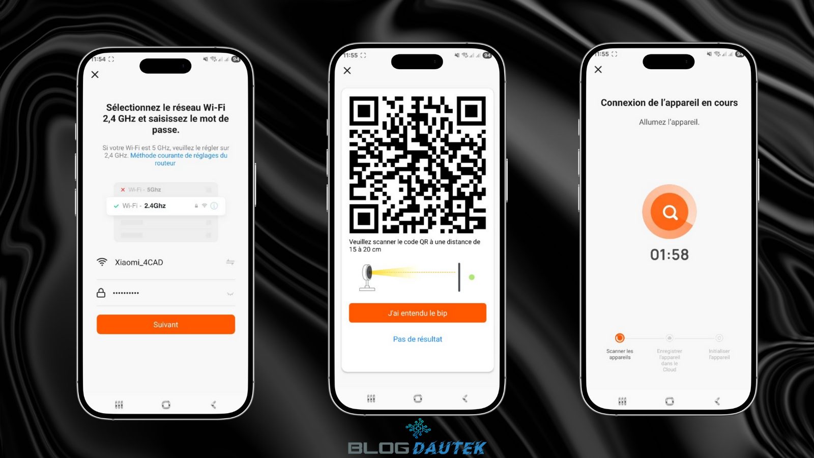 Maintenant, sélectionnez votre Wi-Fi et cliquez sur Suivant. Scannez le QR code sur votre smartphone avec la caméra en se positonnant entre 15 et 20 cm. Cliquez sur J’ai entendu le bip dès que c’est fait.