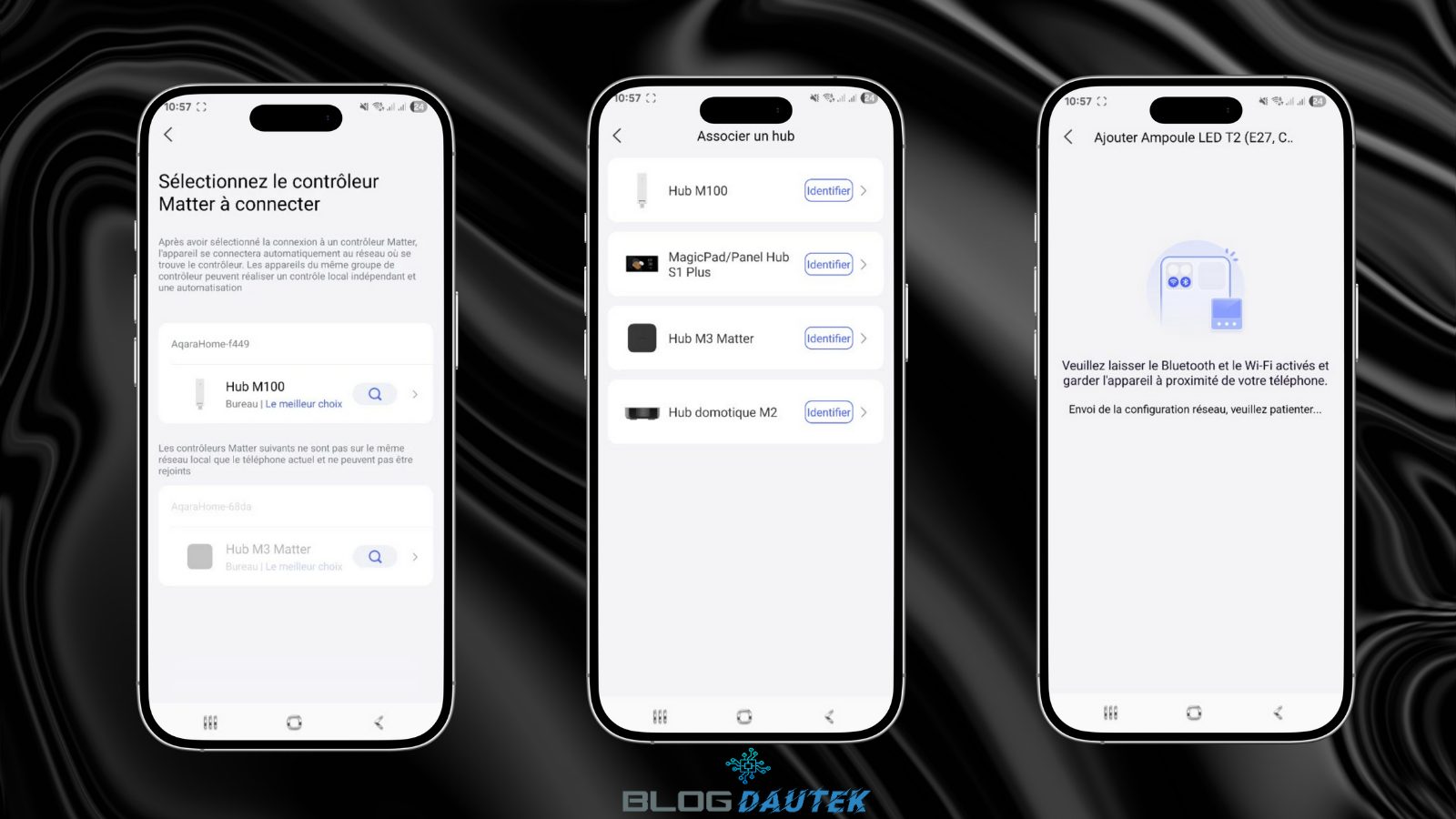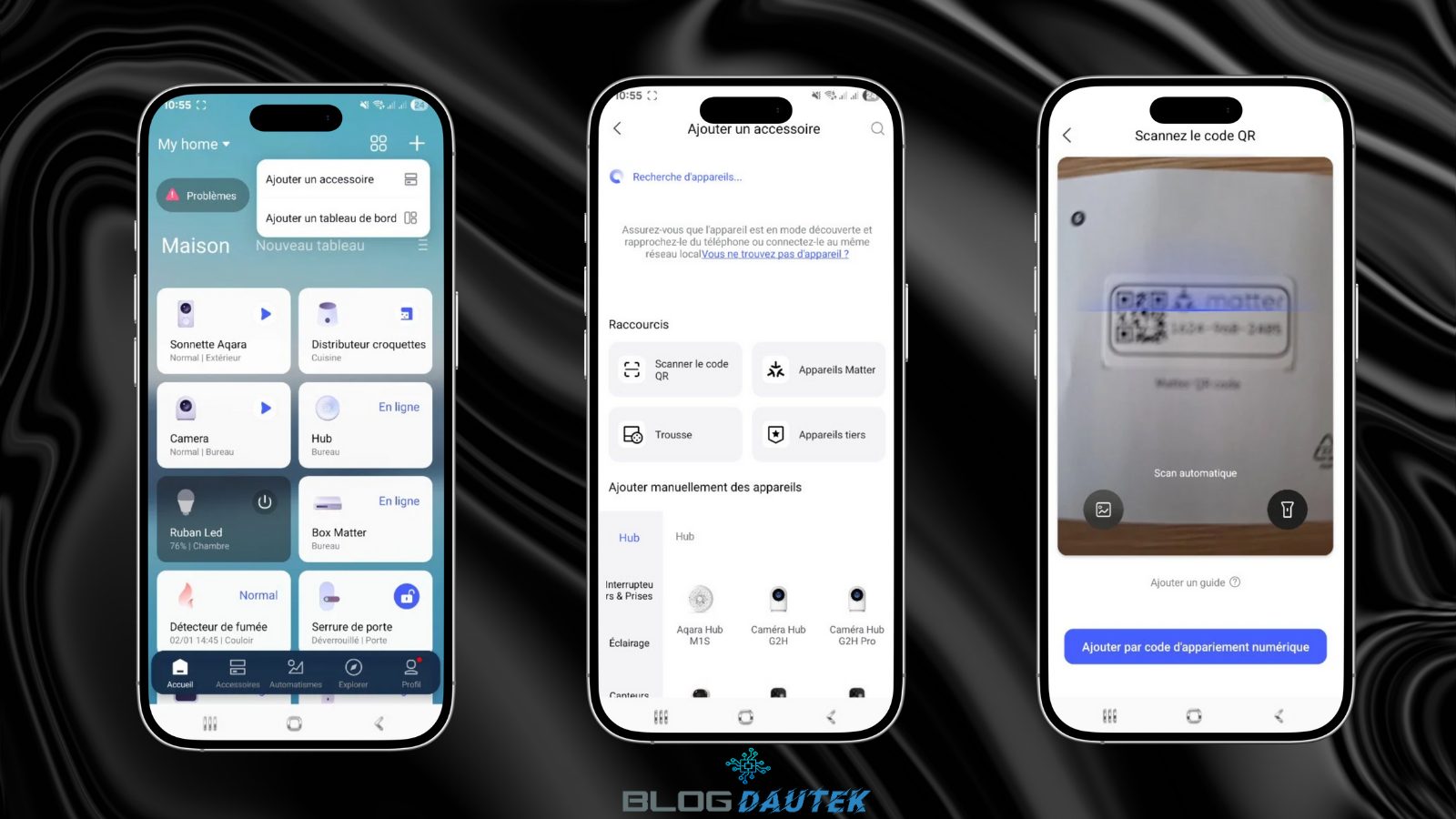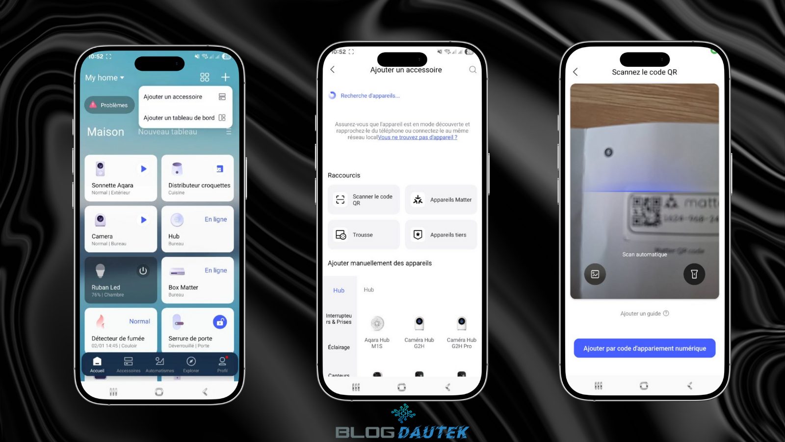 La configuration par défaut de l’ampoule est avec Matter over Thread mais pour Matter comme pour Zigbee, il faut un hub et dans les deux cas, j’utilise le hub M100 Aqara. Pour faire l’intégration, cliquez sur le + en haut à droite et sur Ajouter un accessoire. Ensuite, cliquez sur Scanner le QR code.