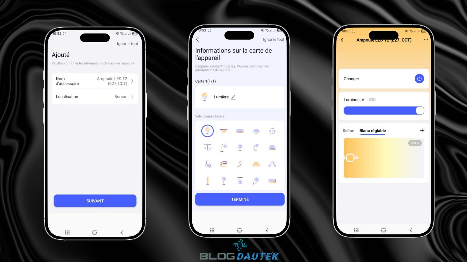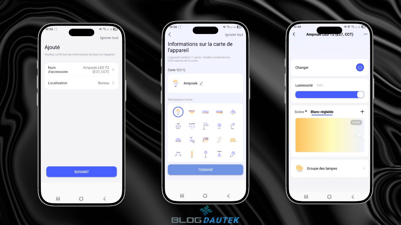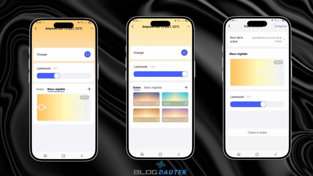 Enfin, vous pouvez voir certains réglages dans les paramètres. De retour sur la page d’accueil, on peut activer l’ampoule.