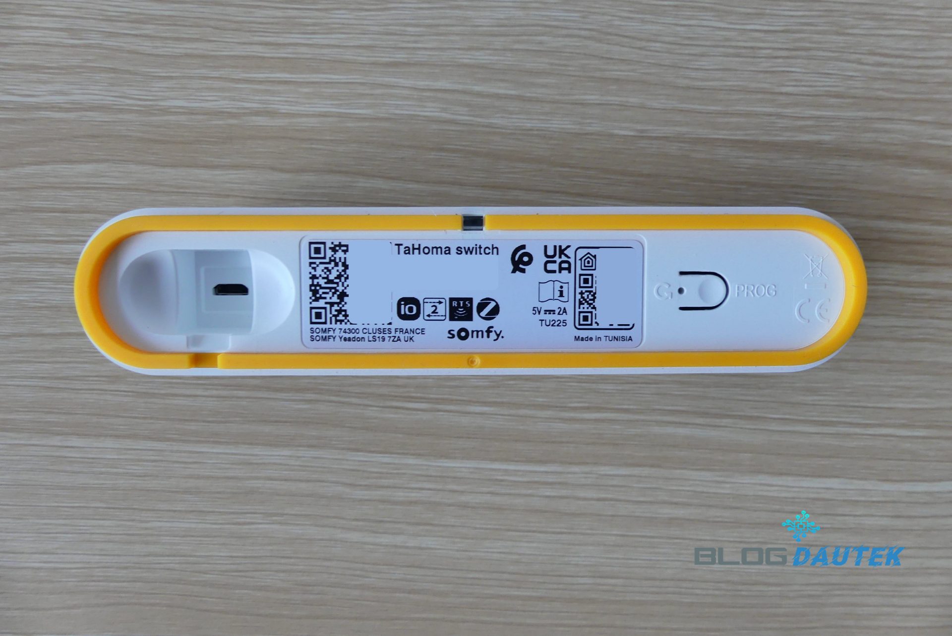 La box est fourni avec un câble d’alimentation et son bloc secteur, ainsi que QR codes pour configuration avec l’application Somfy ou HomeKit.