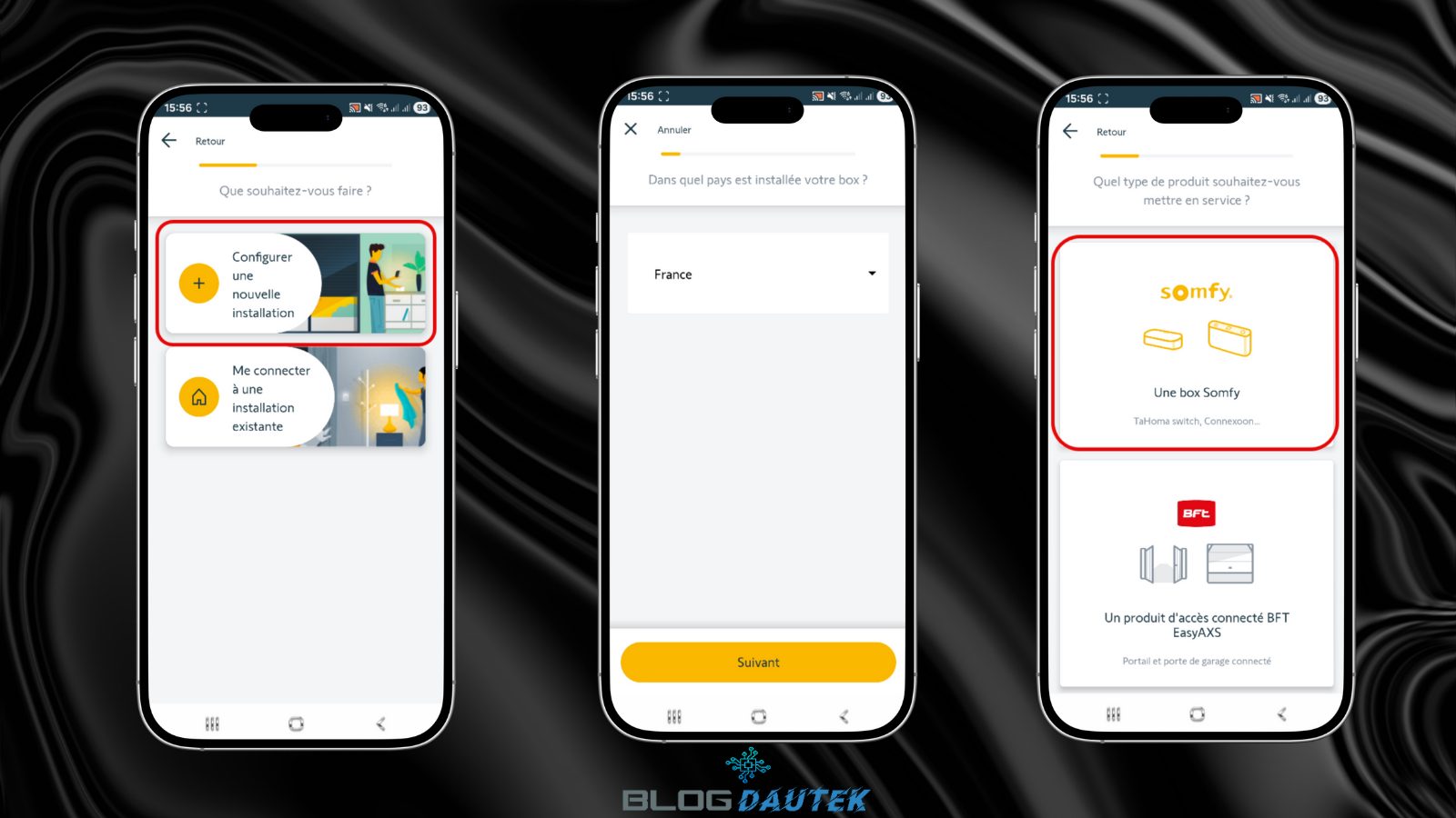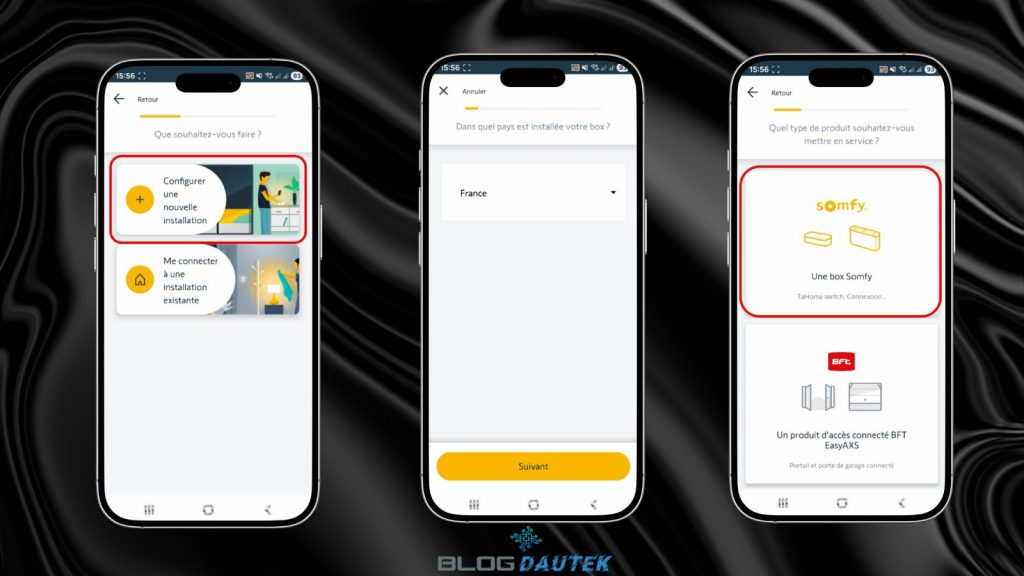 Ensuite, cliquez sur Configurer une nouvelle installation, puis laissez France, puis, sélectionnez Box Somfy.