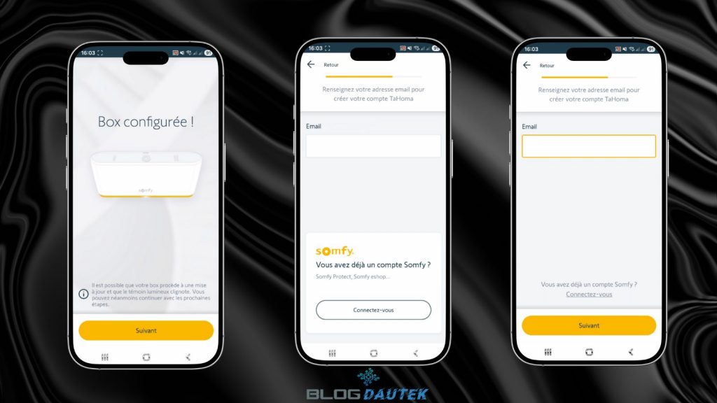 Voilà, la box est configurée ! Maintenant, il faut créer un compte Somfy, sauf si vous en avez déjà un, alors, connectez vous. Sinon, saisissez votre mail.