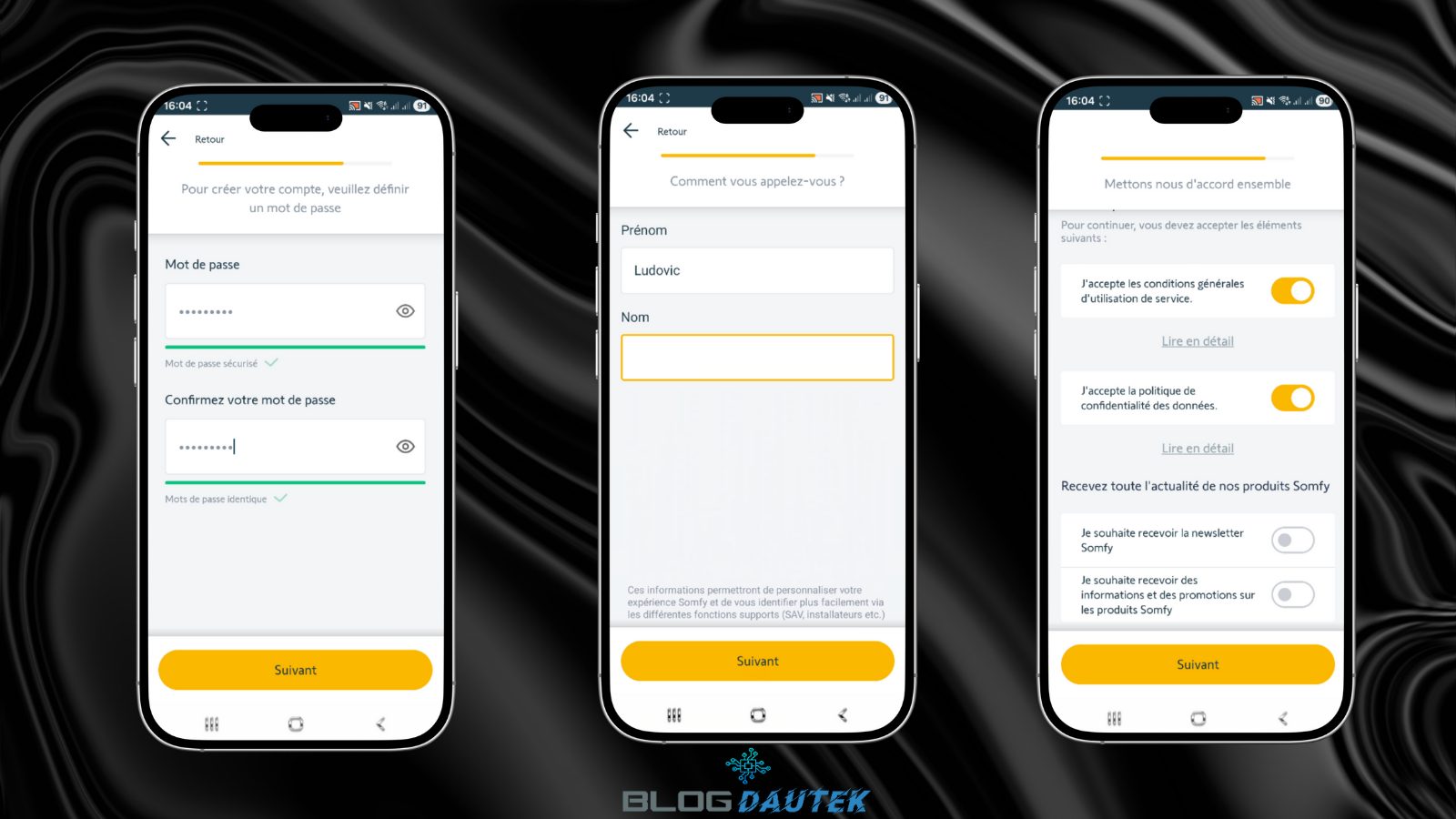 Puis, votre mot de passe et cliquez sur Suivant. Votre prénom et votre nom sont également demandés. Enfin, acceptez les conditions.