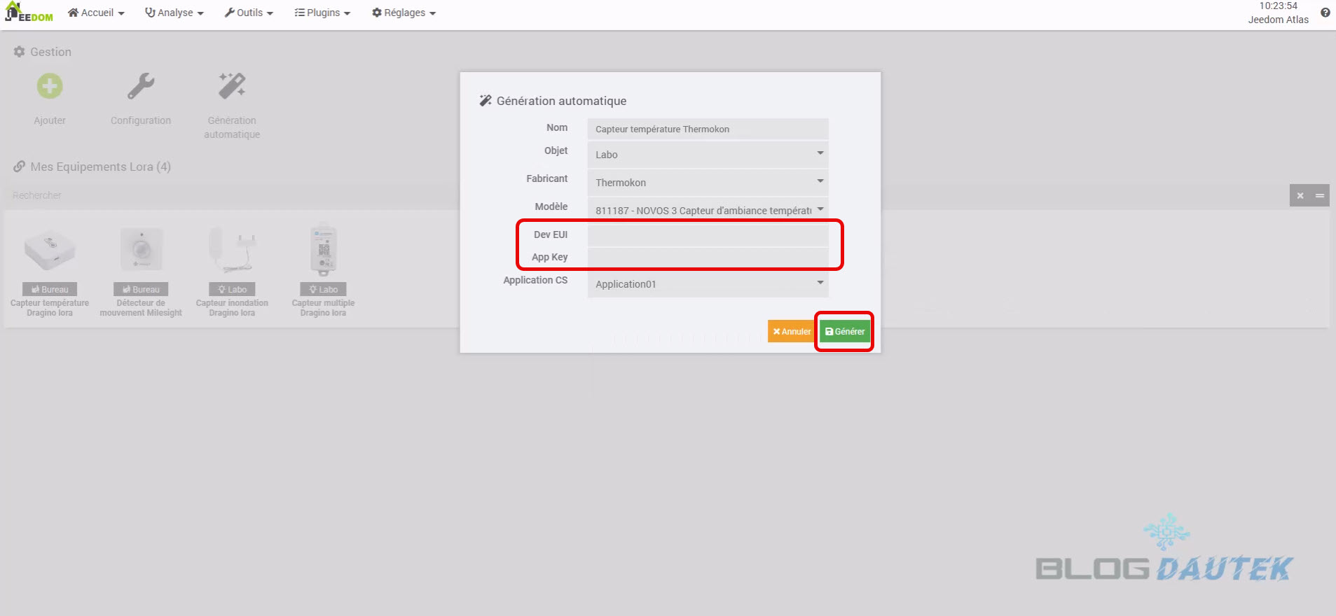 Vous devez remplir quelques informations comme le nom, l’objet, le fabricant et le modèle, puis, remplir les informations Dev EUI et App Key que vous recevez par mail via Domadoo et cliquez sur Générer.