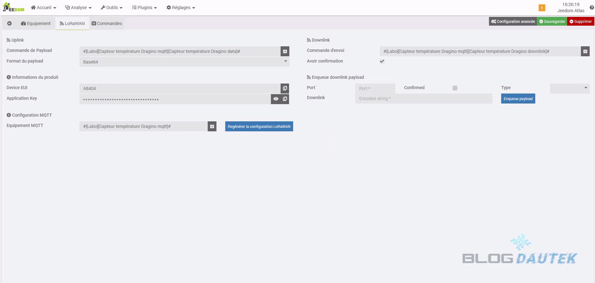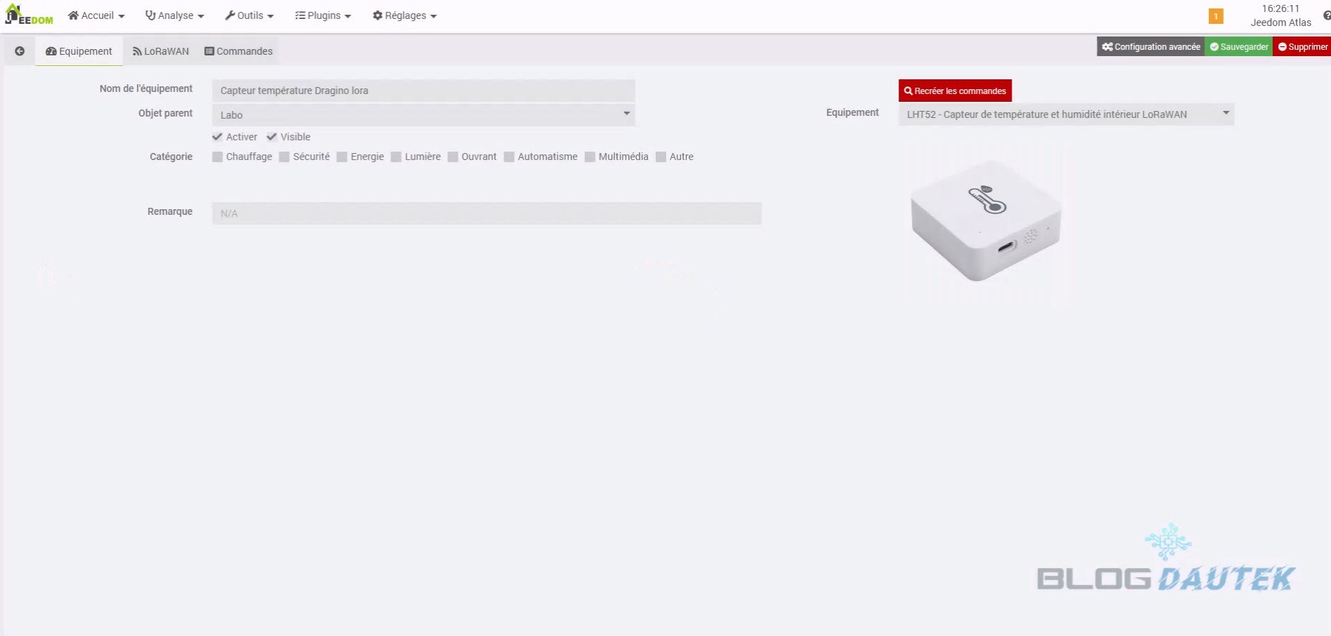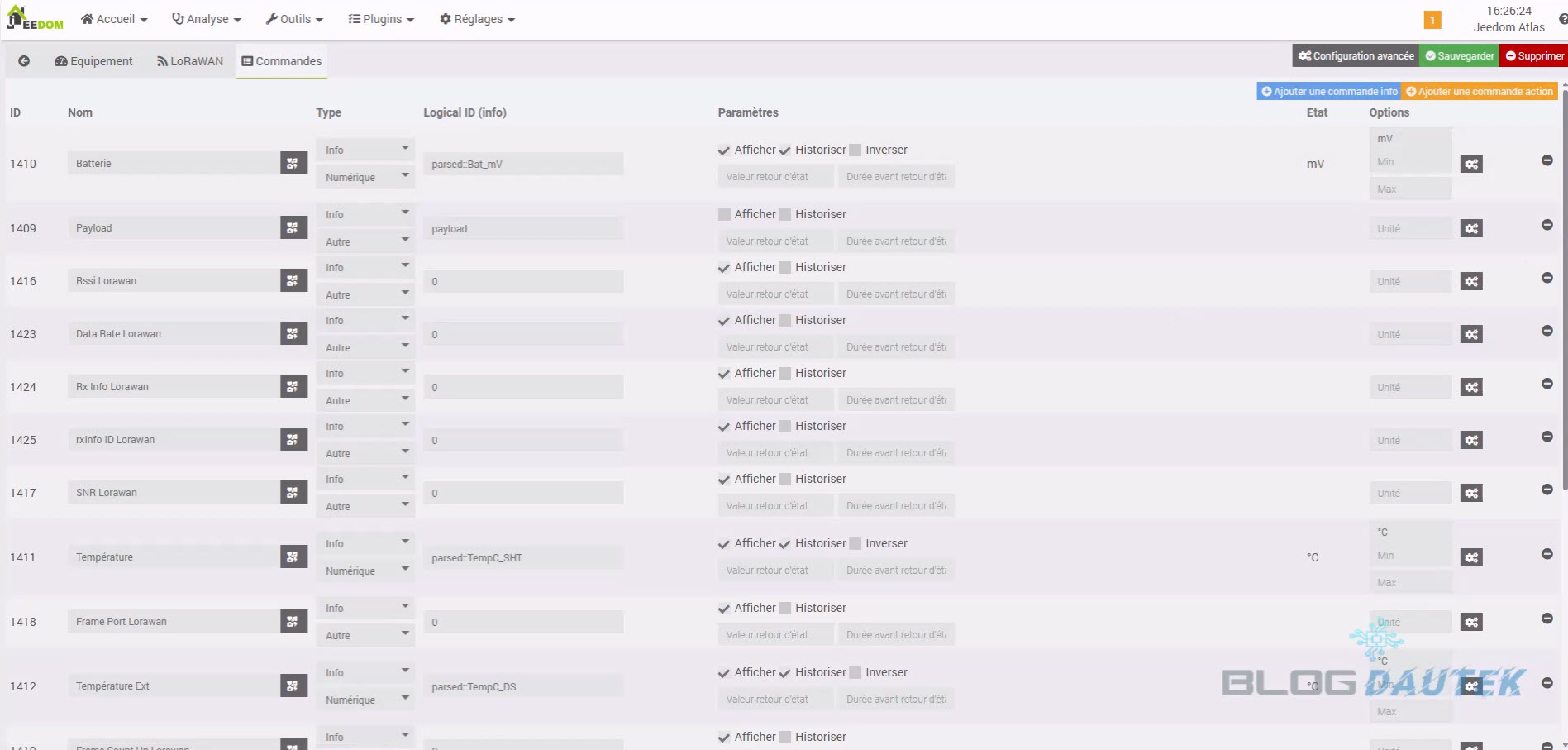 Dans l’onglet équipement, vous avez le nom et la pièce que vous avez saisi.Puis, dans LoRaWAN, vous avez les informations du produit avec l’identifiant et la clé. Enfin, dans l’onglet commandes, toutes les remontées d’informations que vous voulez garder.