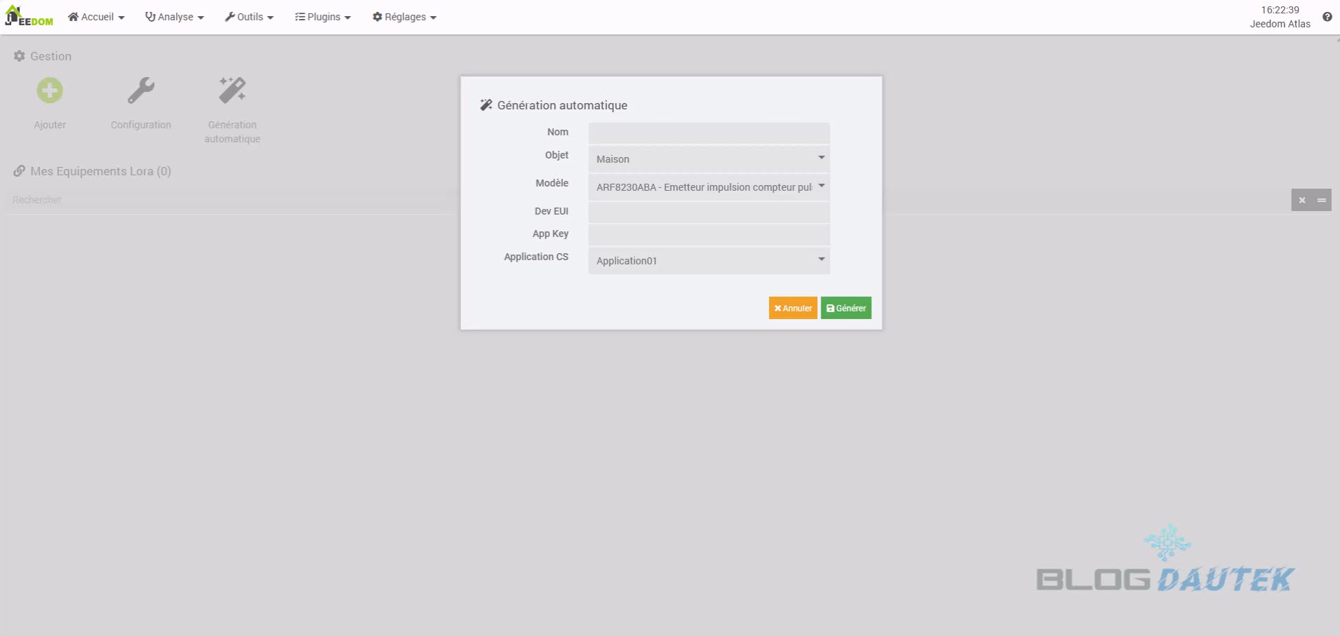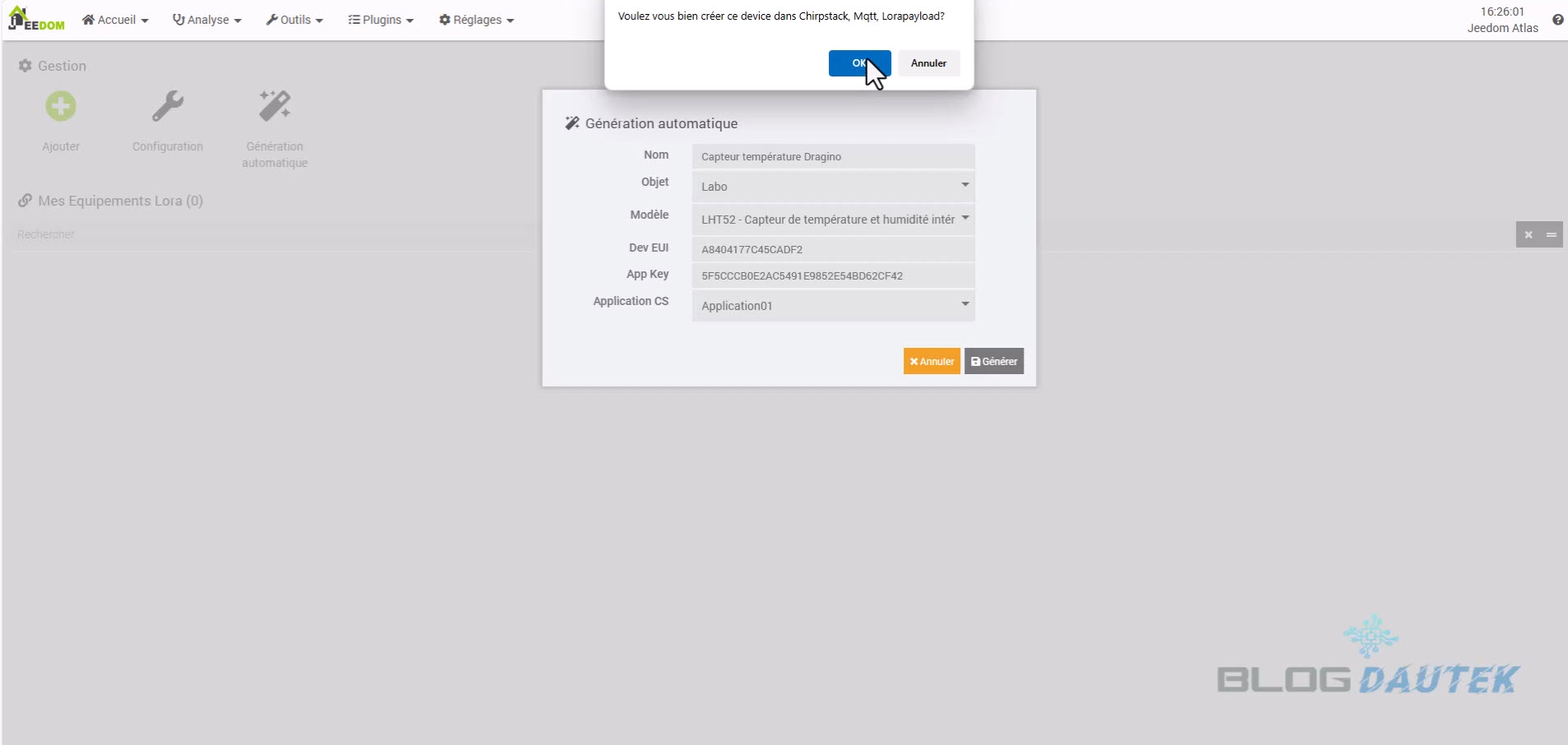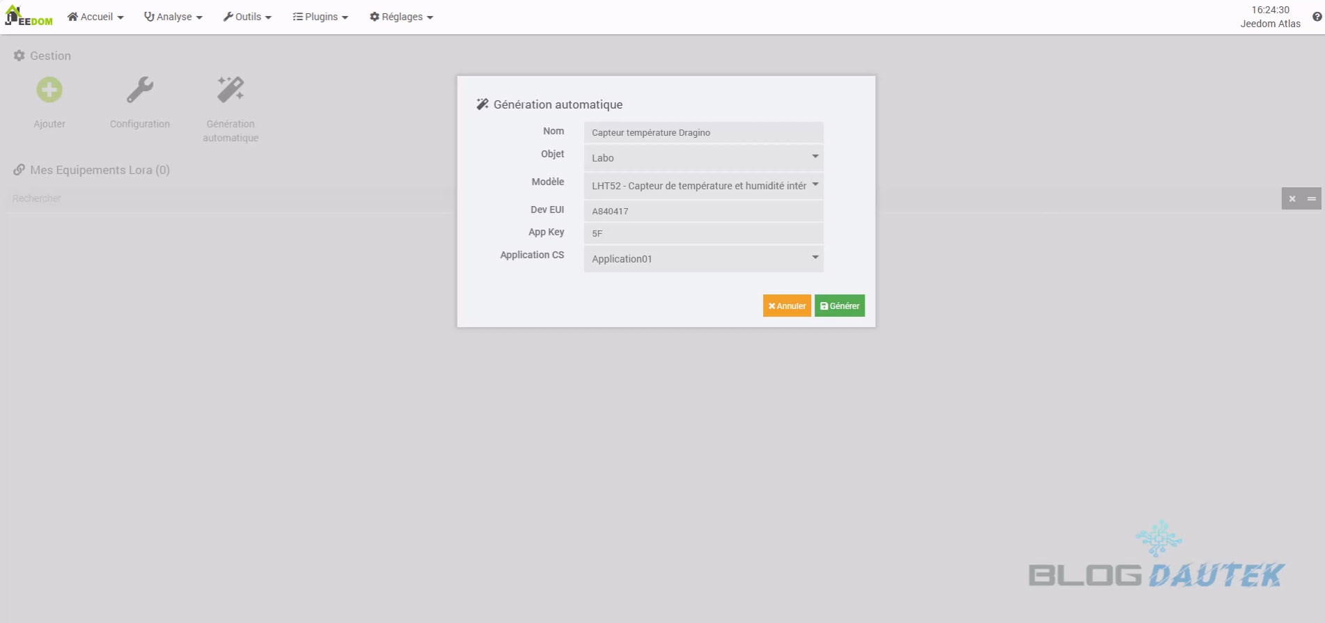 Maintenant, récupérer les informations DEV EUI et APP KEY dans l’emballage et sasir chacun d’eux dans leur case. Laissez Application01 pour la dernière case puis cliquez sur Générer.