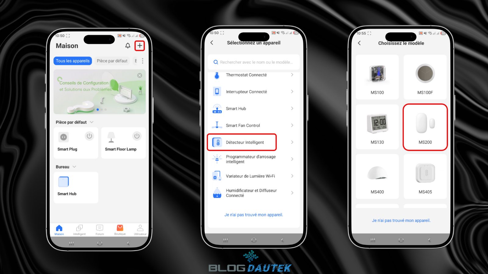 Ouvrez l’application Meross et cliquez sur le + en haut à droite, puis, sur Détecteur intelligent puis MS200.