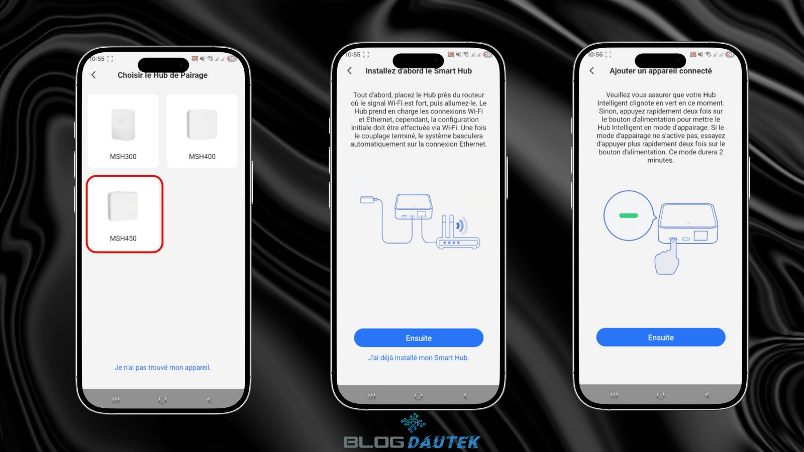 Ensuite, sélectionnez un hub, j’ai fait l’intégration avec le hub MSH450. Sélectionnez le et cliquez sur J’ai déjà installé mon smart hub. Appuyez deux fois sur le bouton d’alimentation du hub pour lancer l’appairage.