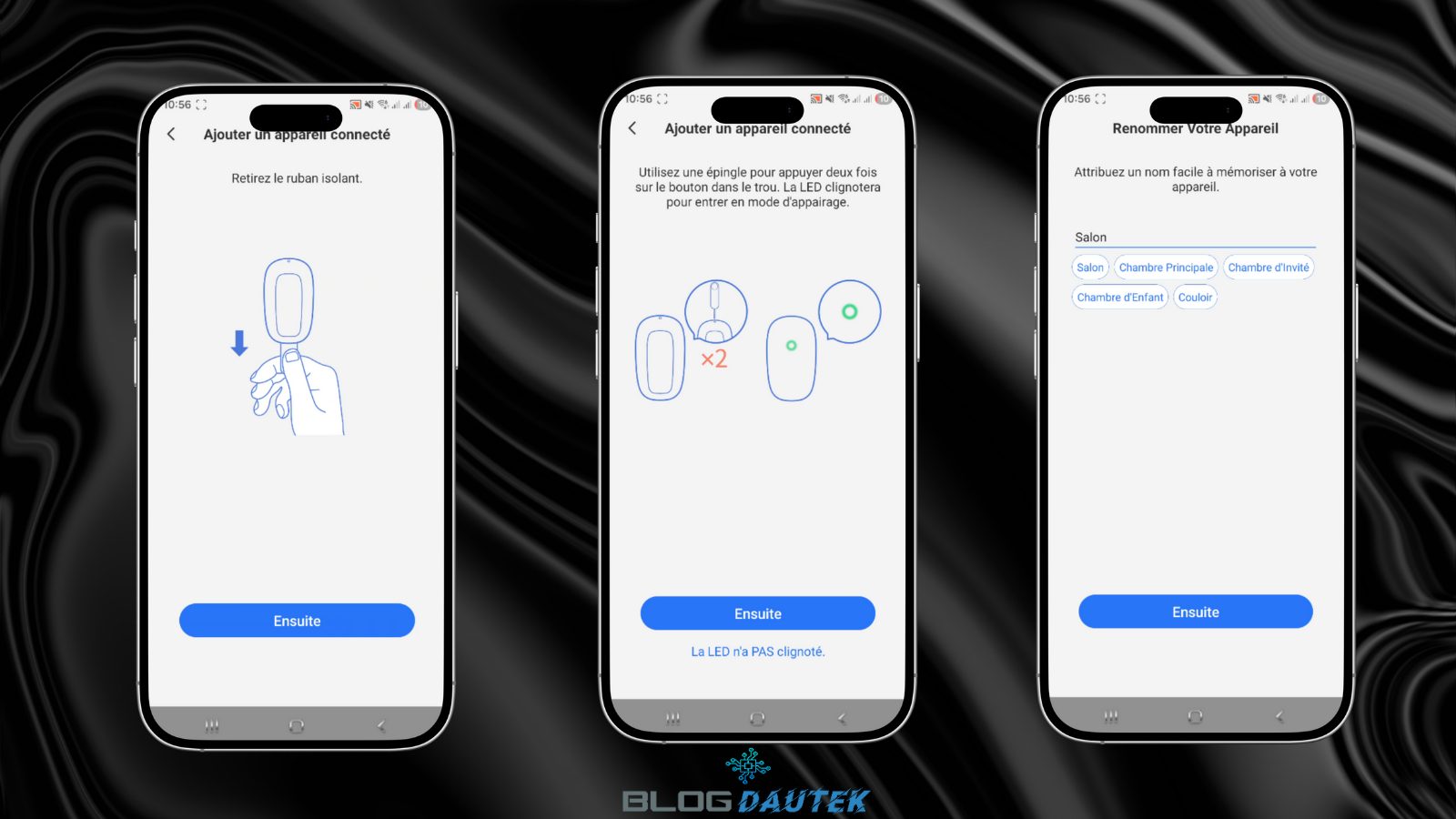 Le détecteur est fournit avec une notice, une pile CR2450 déjà en place, sotch double face pour la fixation et une épingle pour faire le reset pour l’appairage.