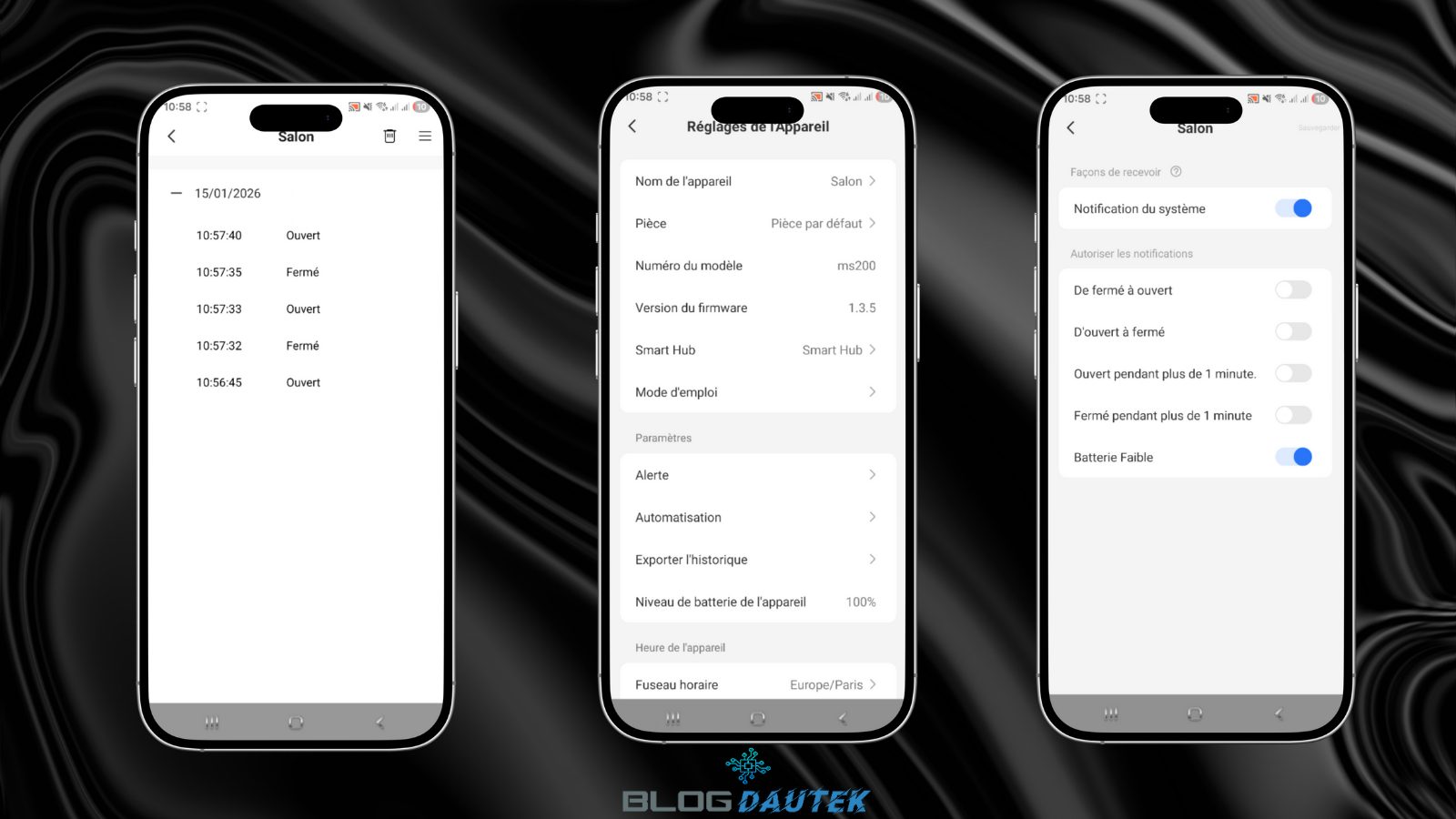 Enfin, en cliquant dessus, vous avez accès à l’historique et aux paramètres, comme par exemple, les notifications pour savoir si le détecteur est ouvert ou fermé.