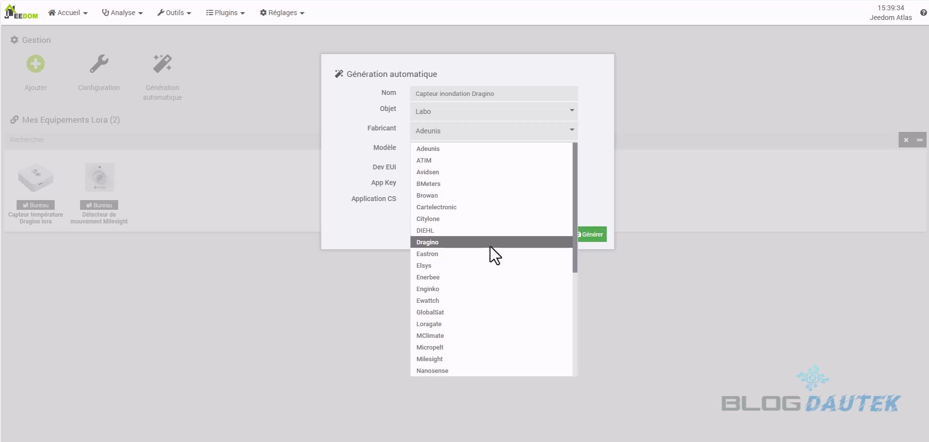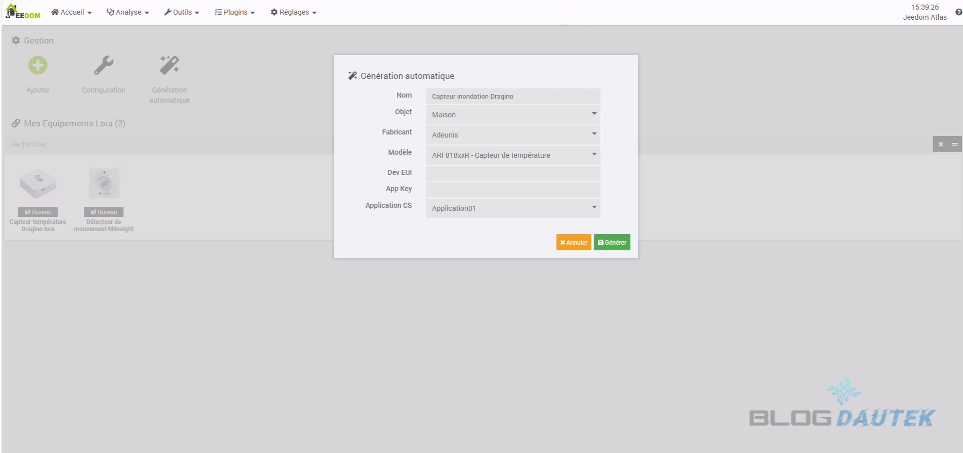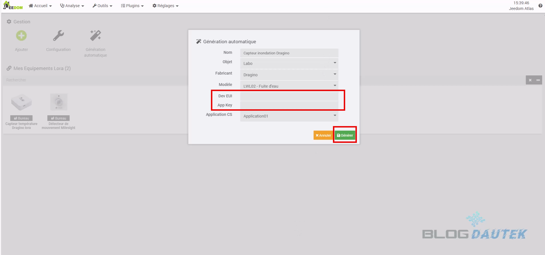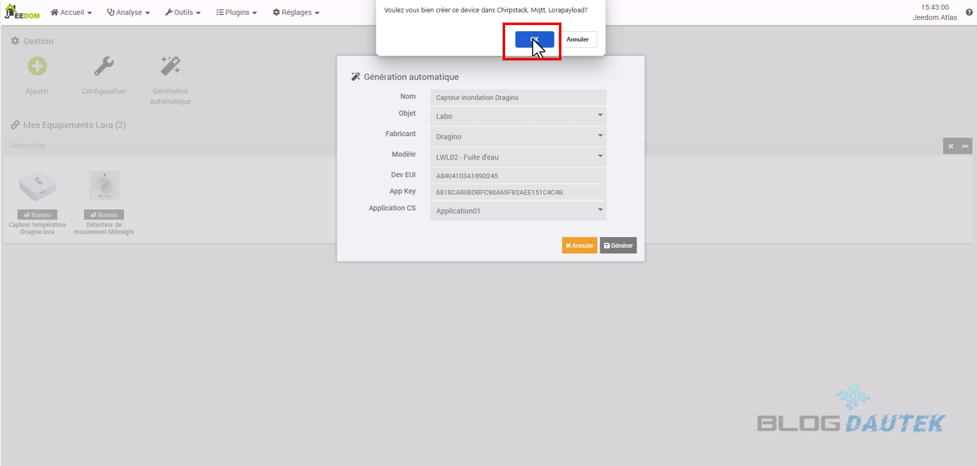 Maintenant, prenez l’étiquette fournie et remplissez les informations DEV EUI et APP KEY dans leur case. Laissez Application01 pour la dernière case puis cliquez sur Générer. Puis, sur OK.