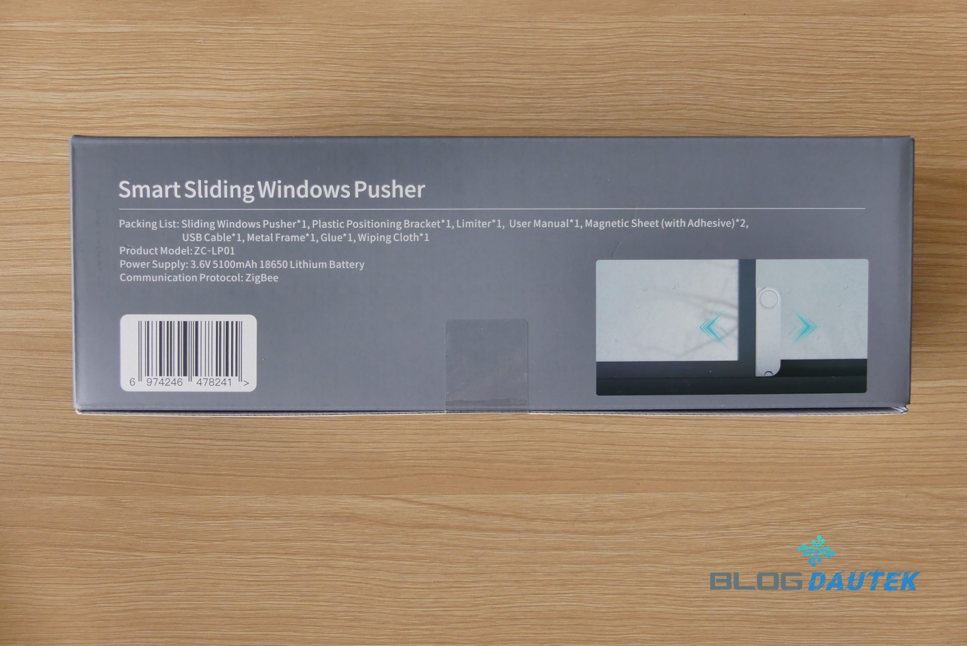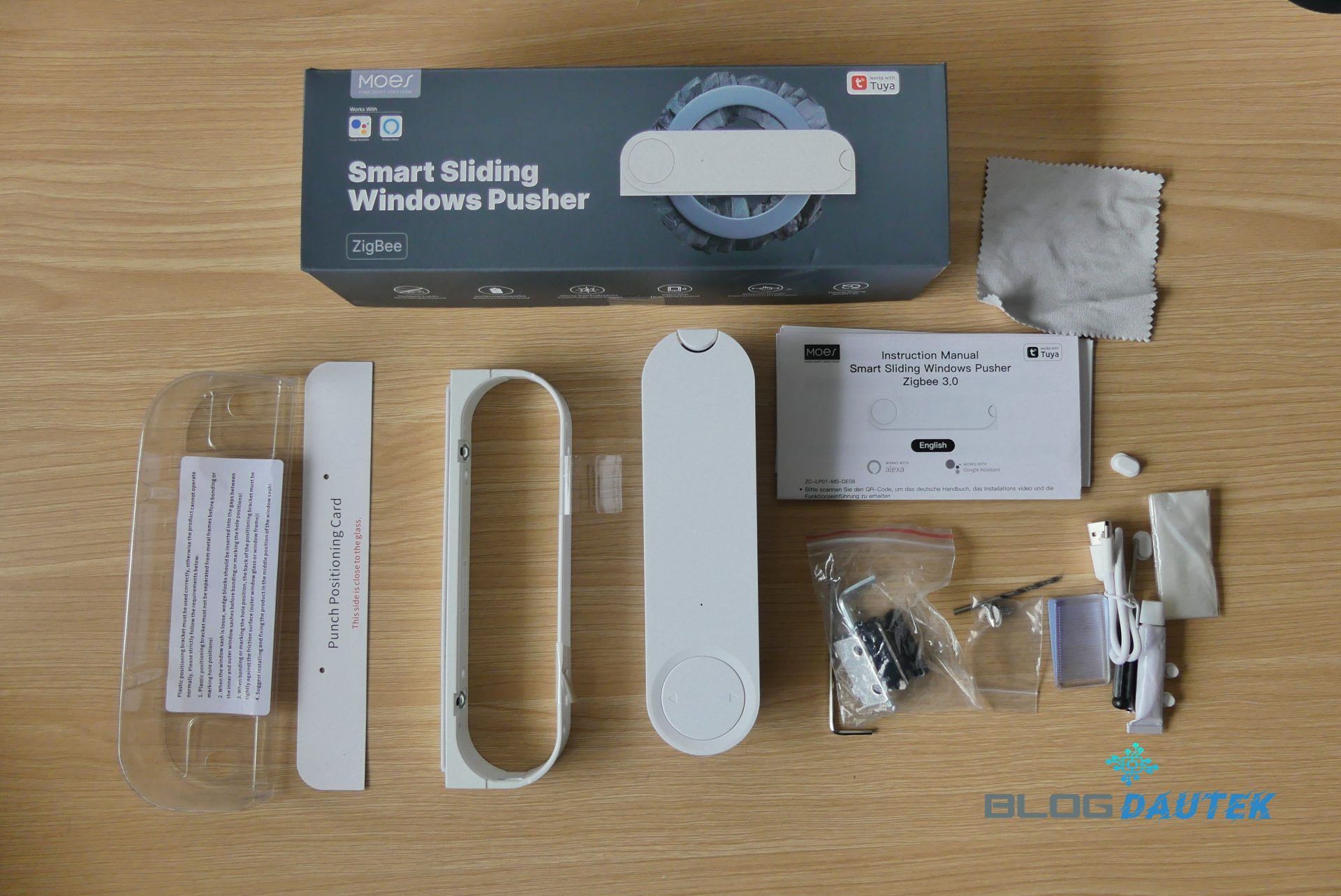 L’ouvre-fenêtre coulissant est fourni avec une notice multilingue dont le français, un support de positionnement en plastique et métal, câble de chargement USB, visserie, colle et un coin en plastique.