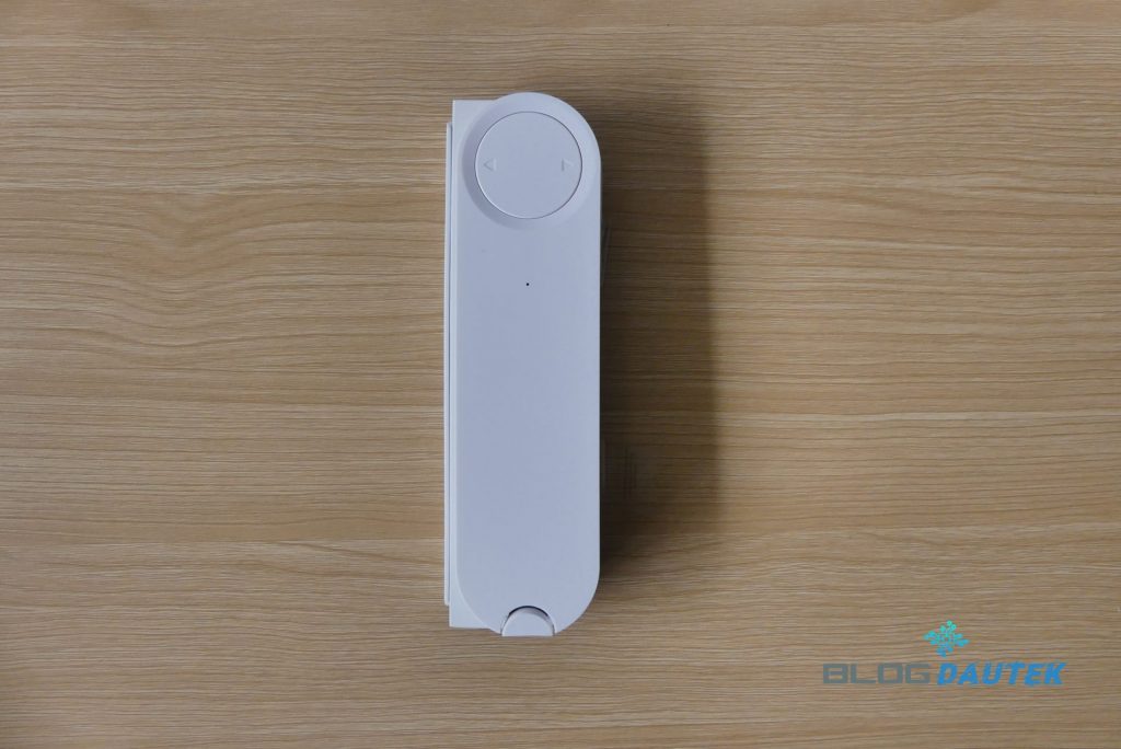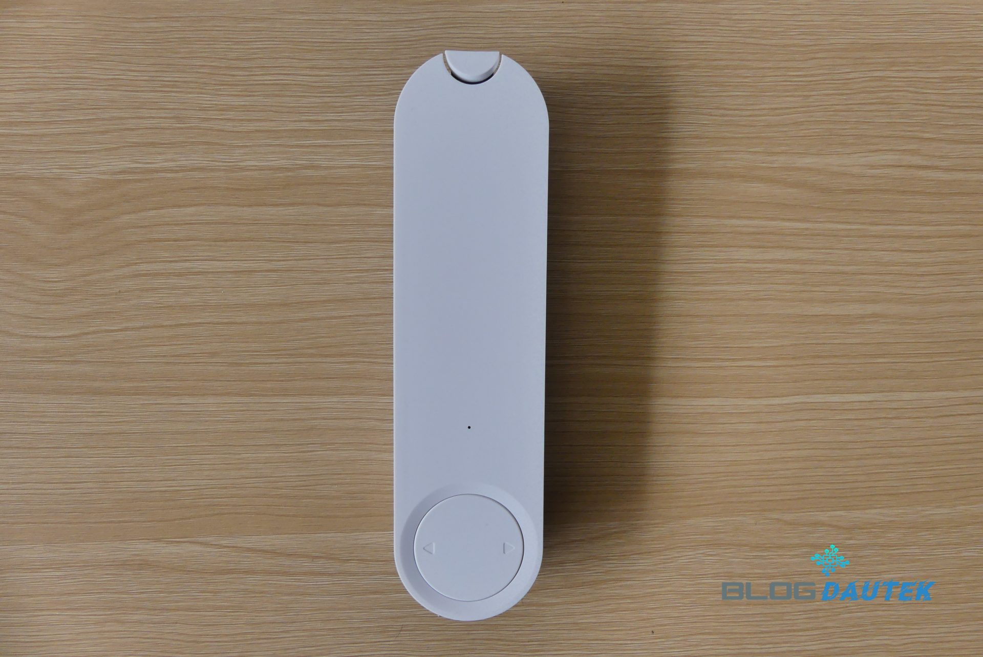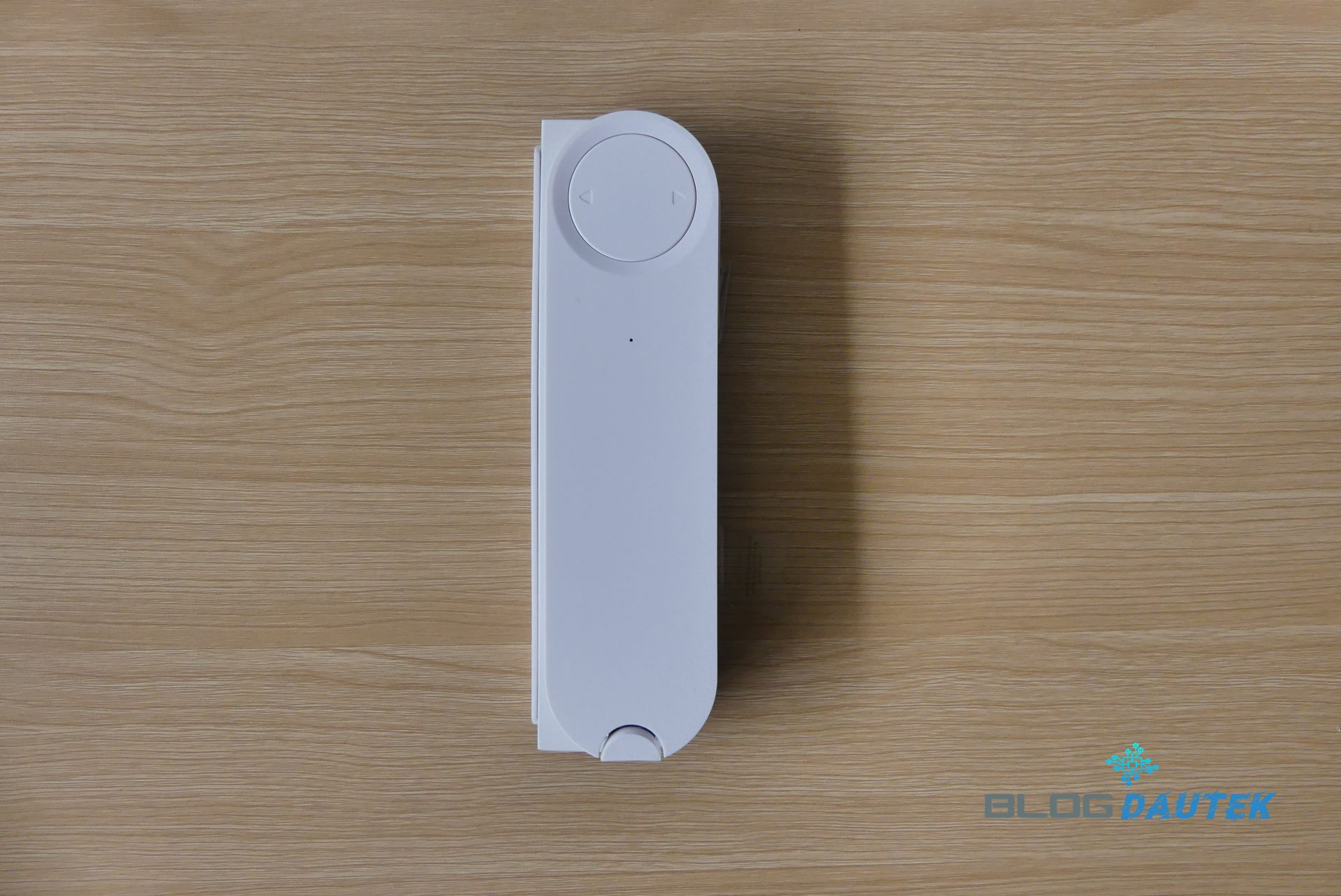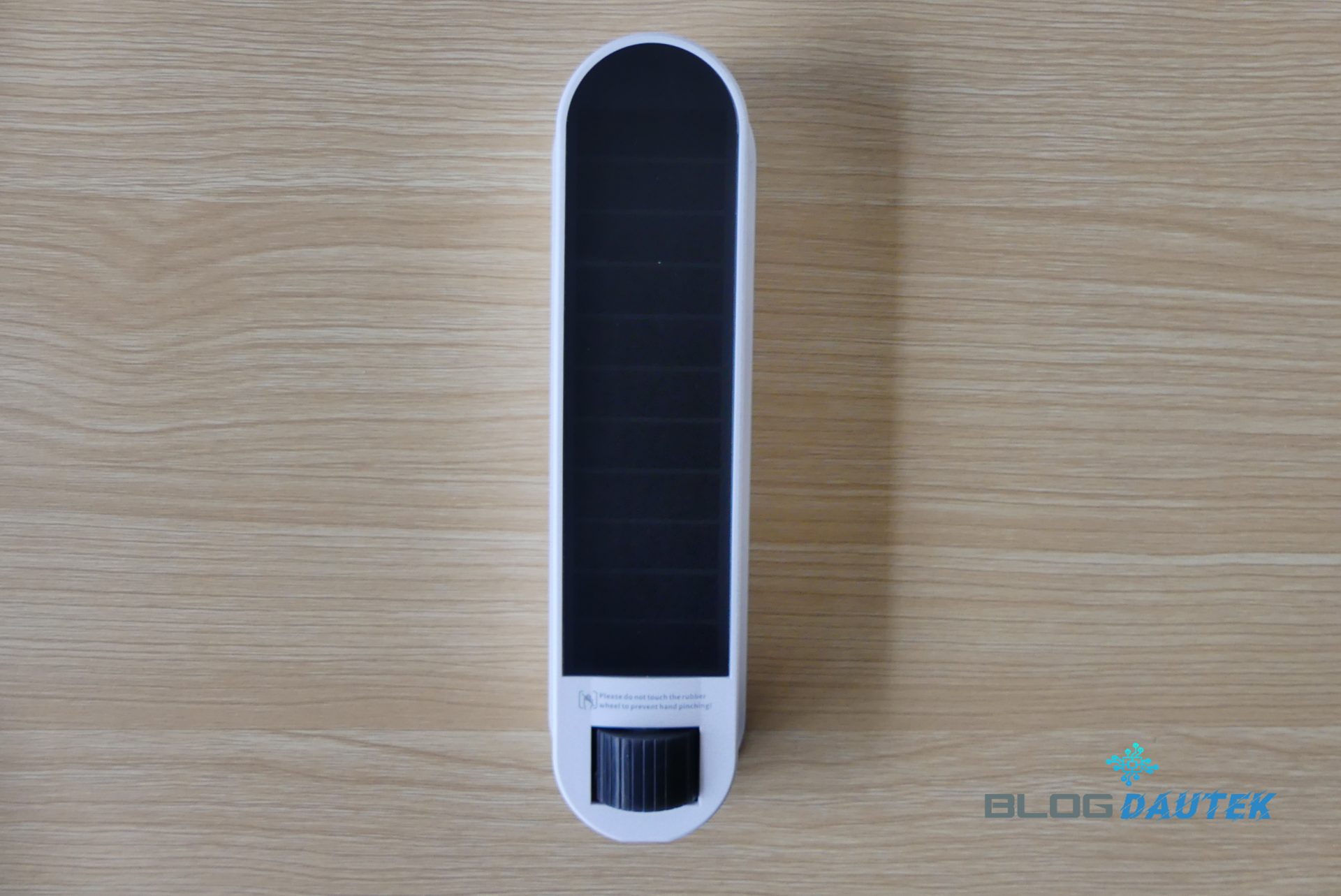 De dos, avec le panneau solaire pour la recharge et le rouleau qui permet d’ouvrir la fenêtre.