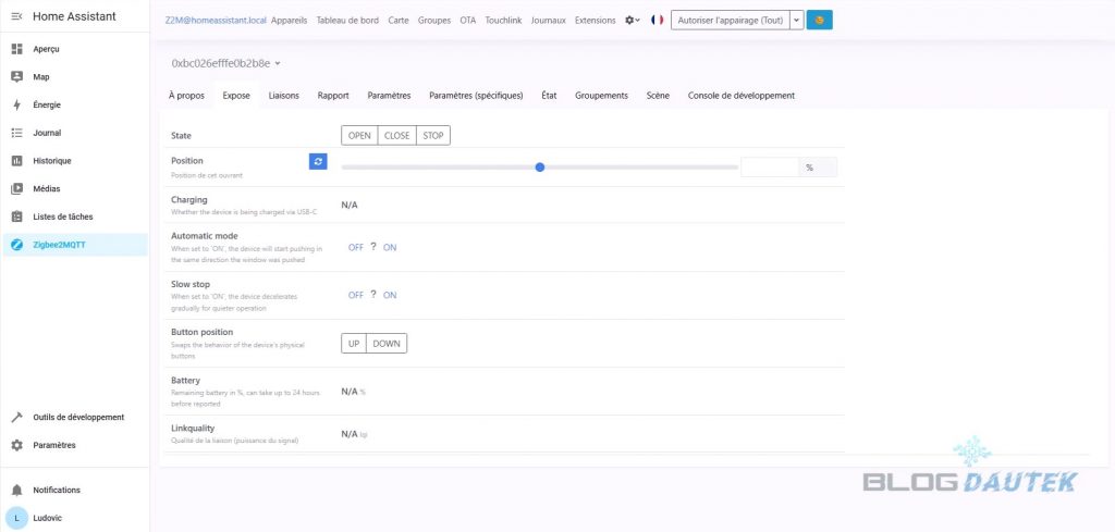 L’ouvre-fenêtre coulissant est intégré à Home Assistant. En cliquant dessus, vous pouvez afficher les détails, et vous avez aussi la possibilité d’accéder à l’onglet Expose pour consulter les informations.