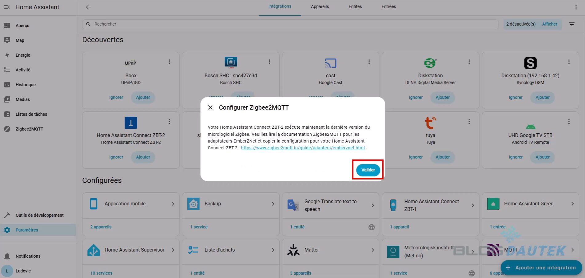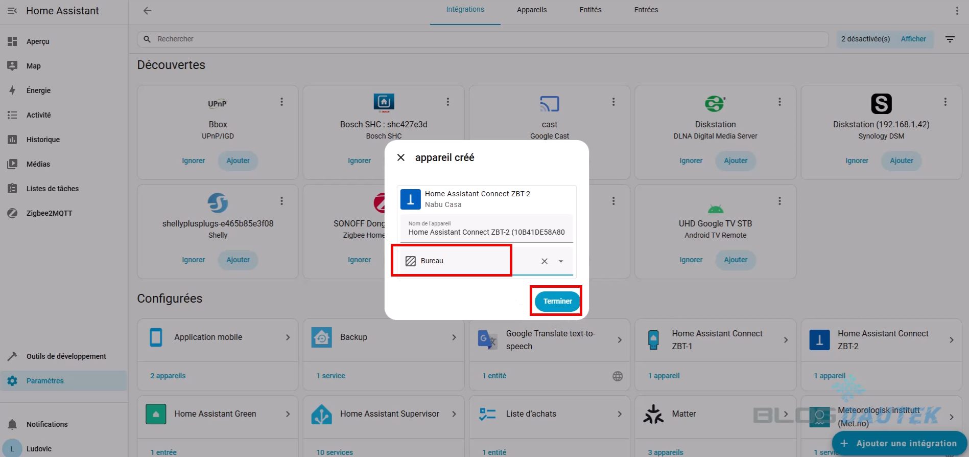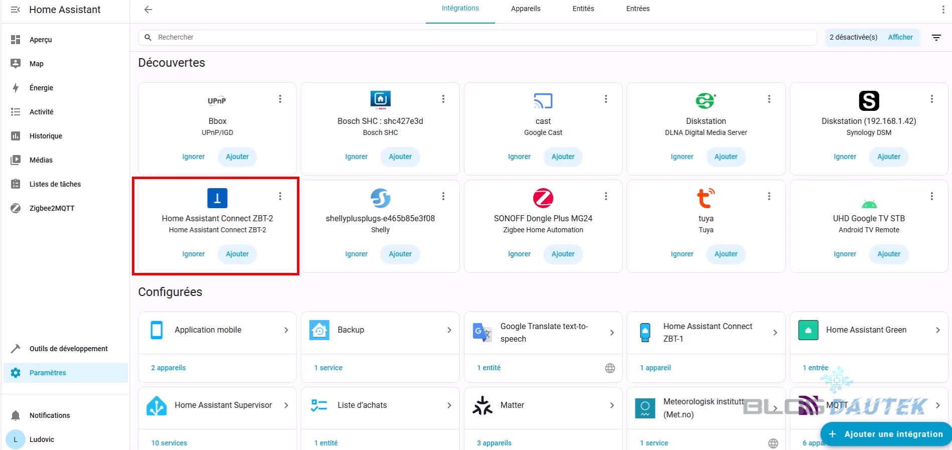 Pour l’intégrer, allez sur Paramètres puis Appareils et services. L’home assistant connect ZBT-2 est détecté, cliquez sur Ajouter.