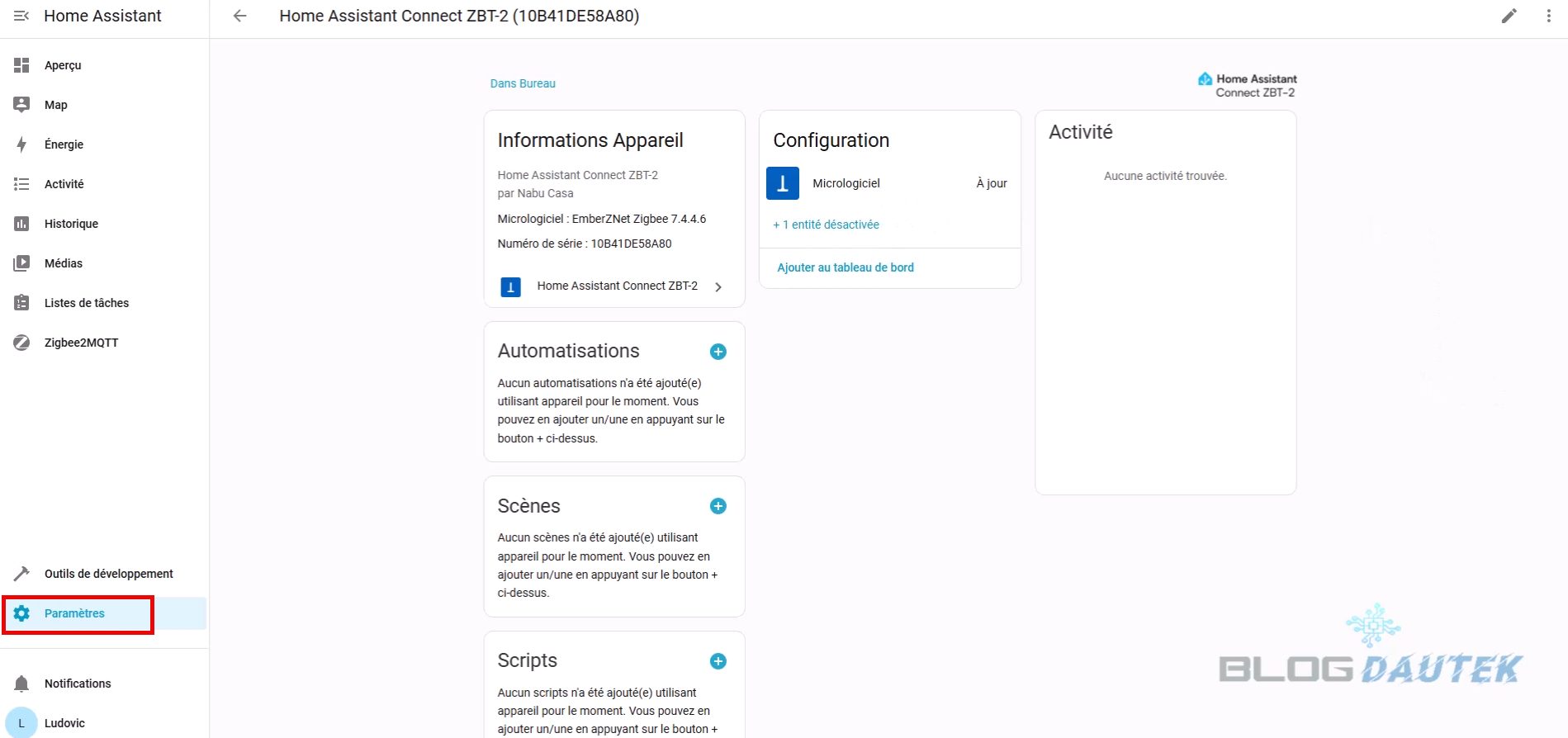 Ensuite, vous êtes redirigé sur la page du dongle. Mais à ce stade, il n’est pas possible d’intégrer de périphérique Zigbee, il faut d’abord finir la configuration, pour cela, cliquez à nouveau sur Paramètres.