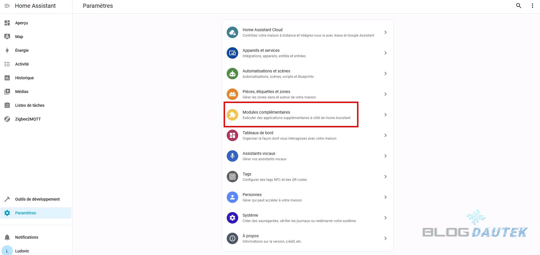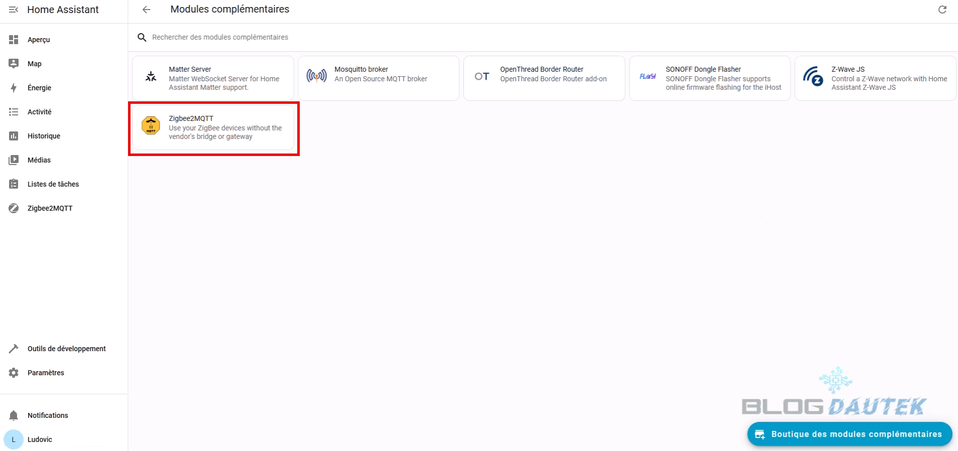 Ensuite, cliquez sur Modules complémentaires puis sur Zigbee2MQTT..