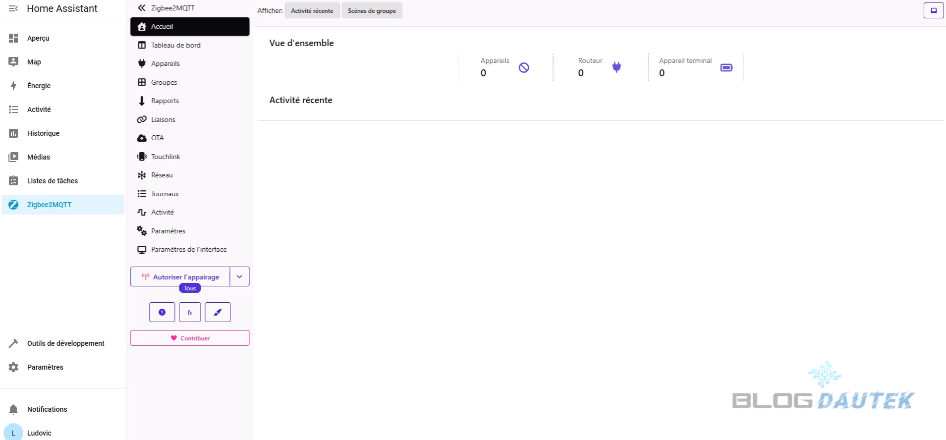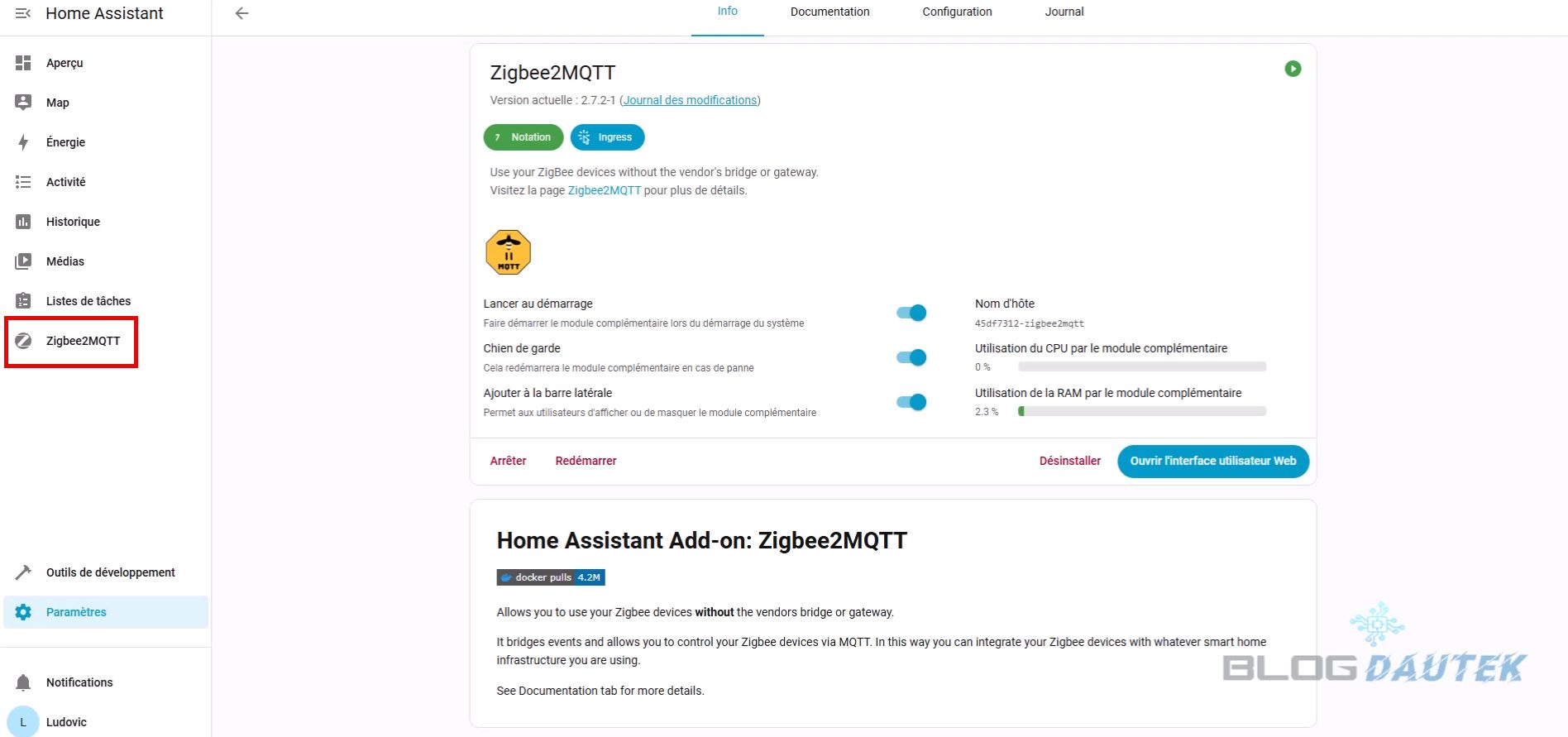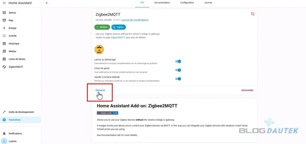 Cliquez sur Démarrer pour relancer le module puis cliquez sur Zigbee2MQTT dans la barre latérale.