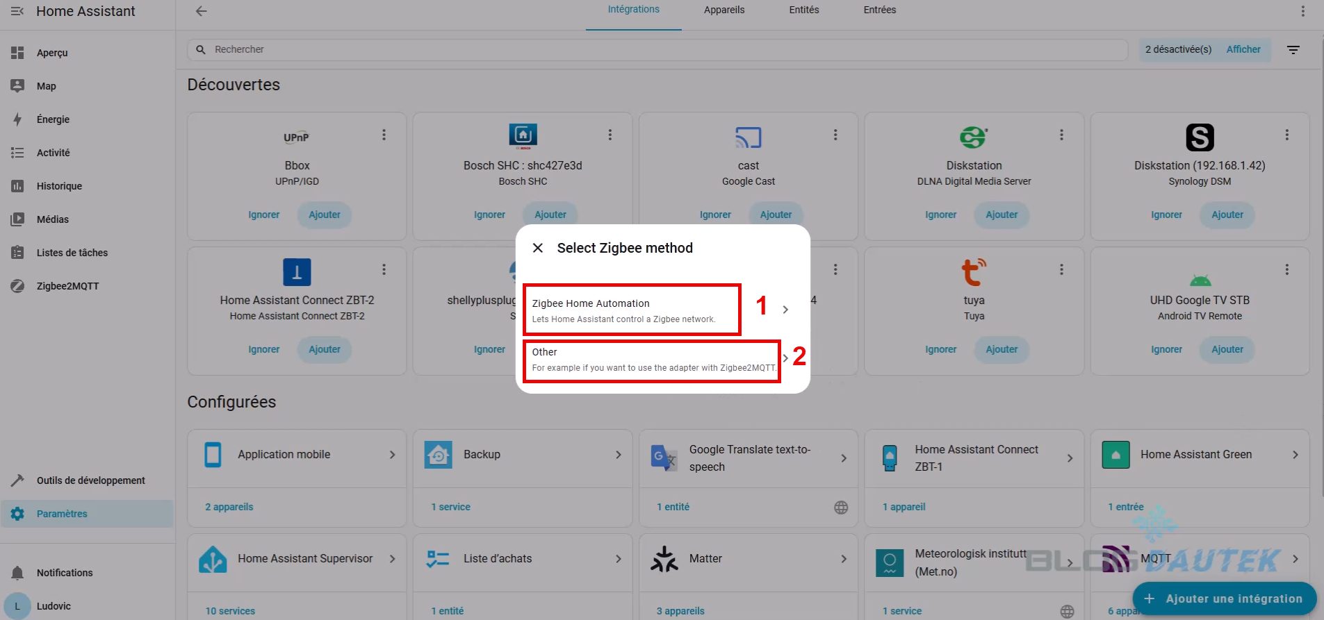 Pour ma part, je fais le choix de l’installer sur le protocole Zigbee et avec Zigbee2MQTT. Pour le Zigbee, vous avez deux possibilités qui sont ZHA ou Zigbee2MQTT à choisir selon votre situation, cliquez sur :