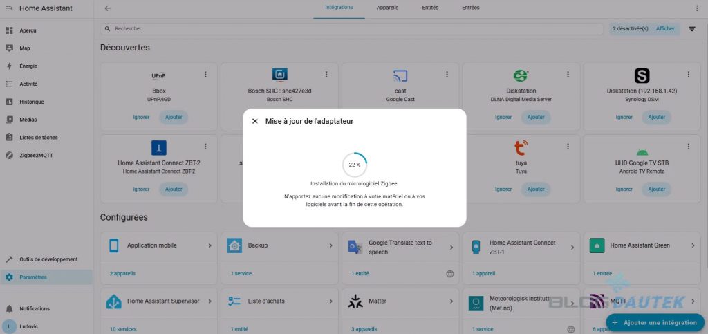 Le dongle se met à jour et l’intégration terminée, cliquez sur Validez pour le configurer avec Zigbee2MQTT.