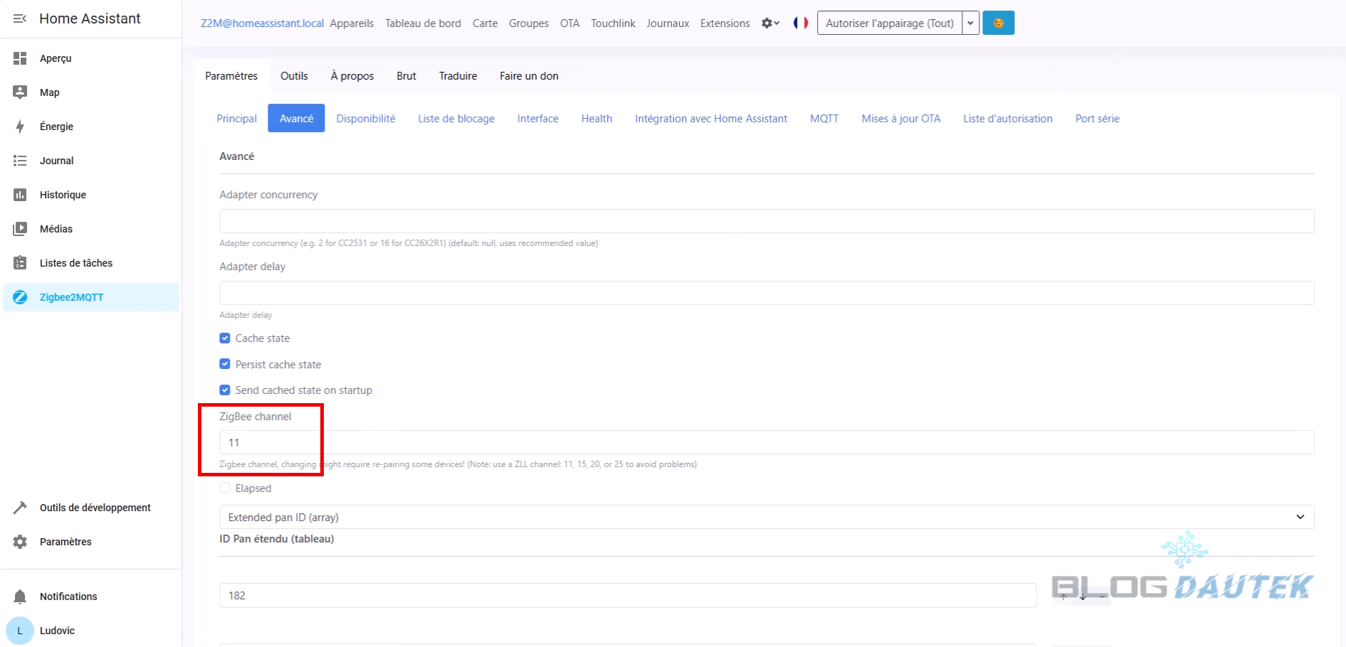 Ensuite, cliquez sur l’onglet Avancés et au niveau de Zigbee channel on voit le chiffre 11 dans mon cas, ceci est mon canal radio.