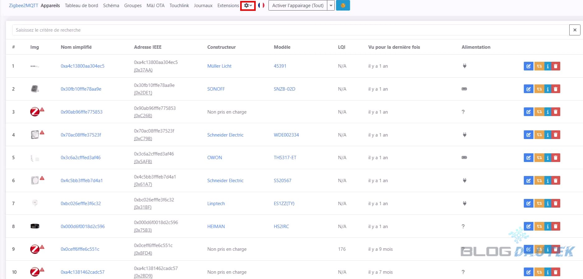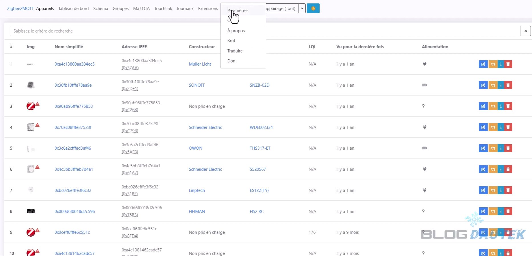 Ensuite, comme pour Jeedom, cliquez sur la roue crantée puis sur Paramètres.