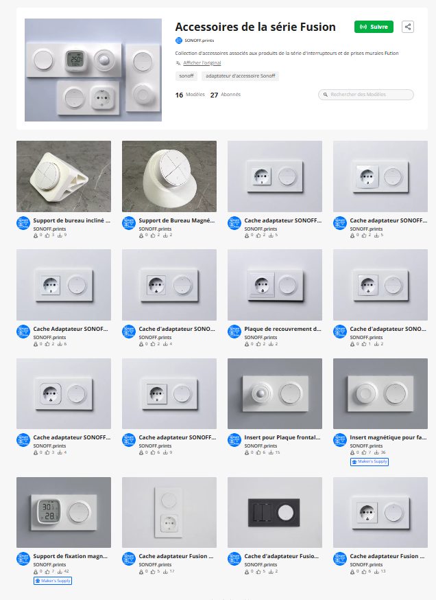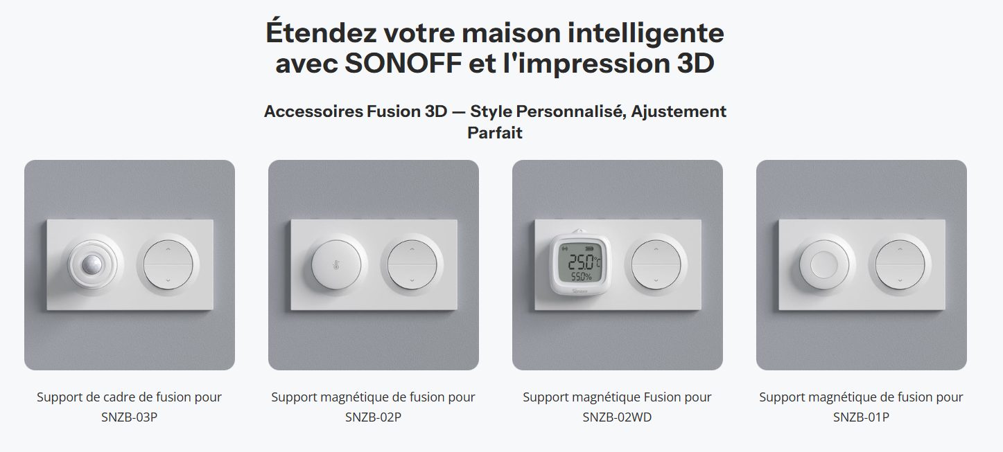 Mais pas que des interrupteurs, car oui, Sonoff a pensé à tout, car pour ceux qui ont la chance d’avoir une imprimante 3D, nous pouvons imprimer les différents fichiers 3D créés par eux, pour y intégrer un capteur de température ou détecteur de mouvement par exemple.