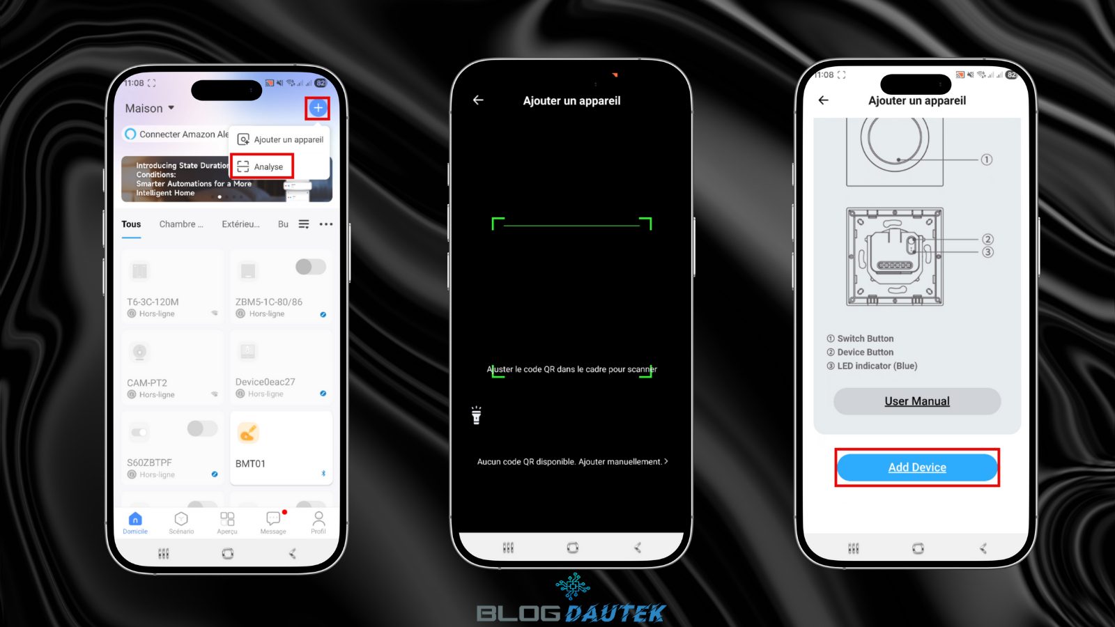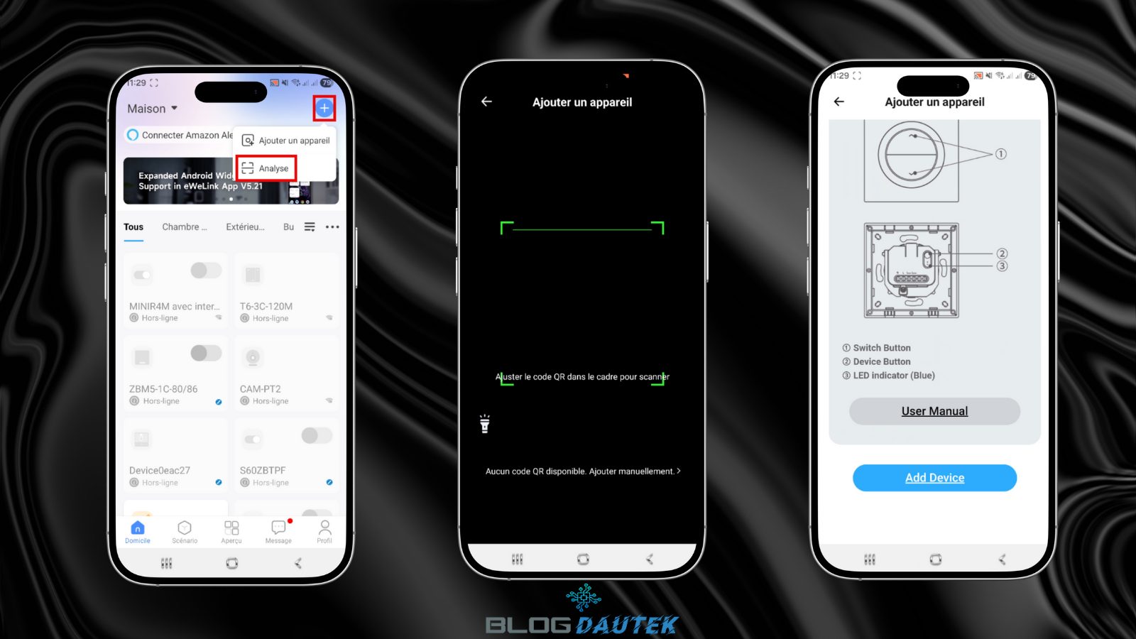 Pour configurer l’interrupteur Sonoff dans l’application, vous devez disposer d’un compte Ewelink. . Pour l’intégrer, cliquez sur le + en haut à droite puis, sur Analyse. Cliquez sur User Manuel pour accéder à la notice et sur Add Device pour commencer l’intégration.