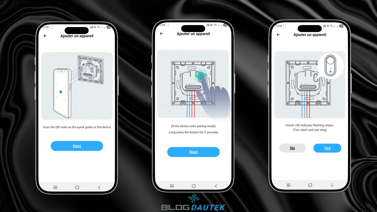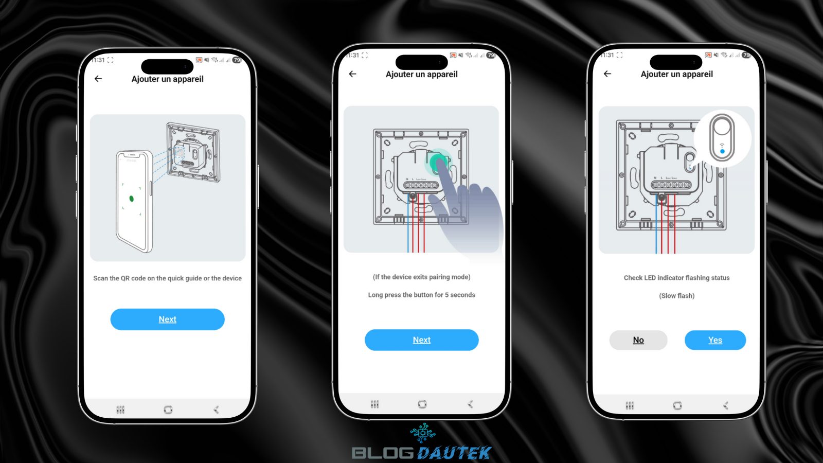Ensuite, branchez l’interrupteur et cliquez sur Next. Appuyer 5 secondes sur le bouton du bas et cliquez à nouveau sur Next. Puis, si la LED bleu clignote sur le module, cliquez sur Yes.