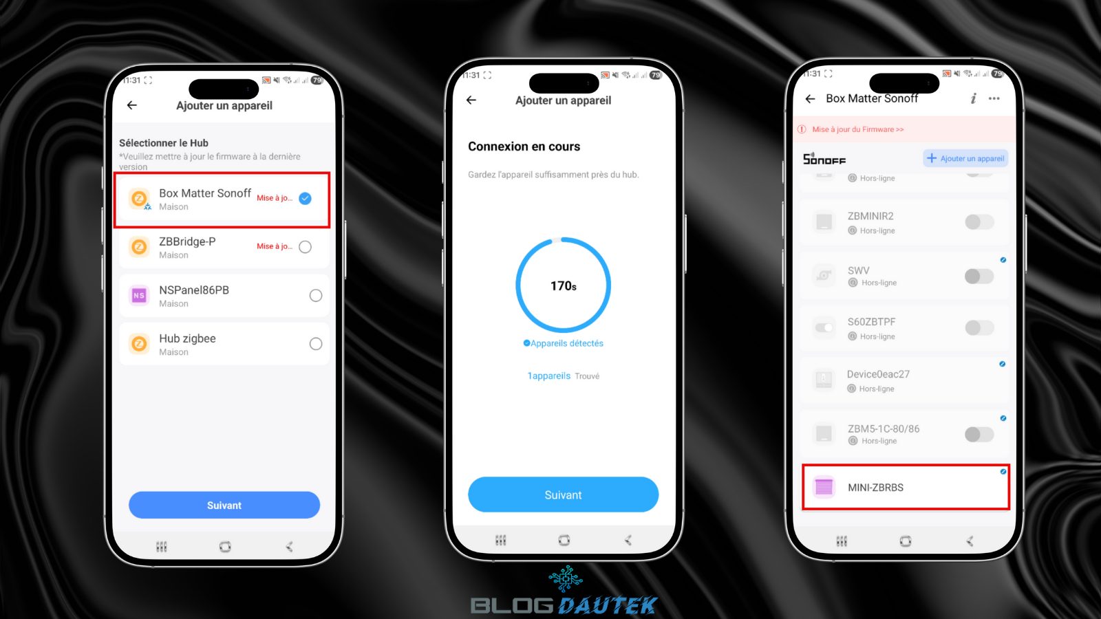 Maintenant, comme c’est du Zigbee et pas du matter over WiFi, il faut une passerelle, pour cela j’ai pris la box domotique Matter de Sonoff. Sélectionnez là et laisser sa connexion se faire. Vous retrouvez l’interrupteur dans la liste de la box.