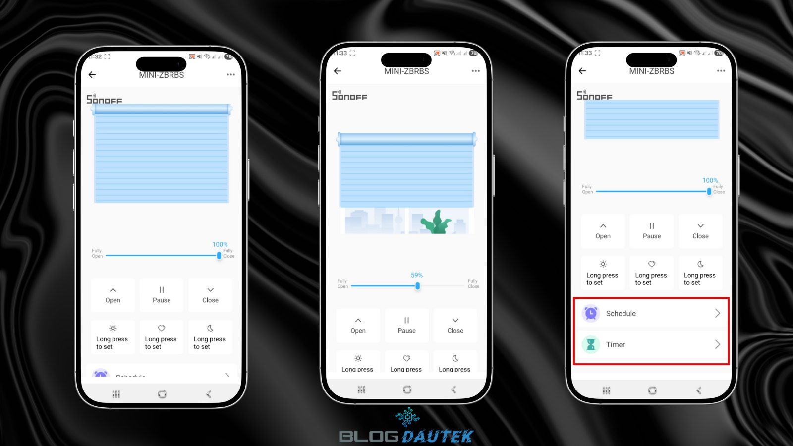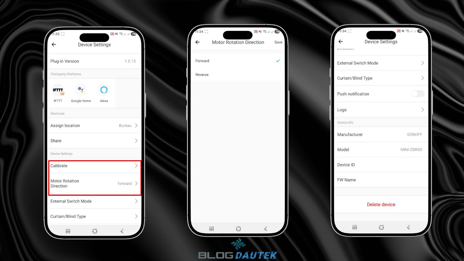 Enfin, dans les paramètres, vous pouvez refaire la calibration ou changer le sens du moteur, parmi d’autres réglages.