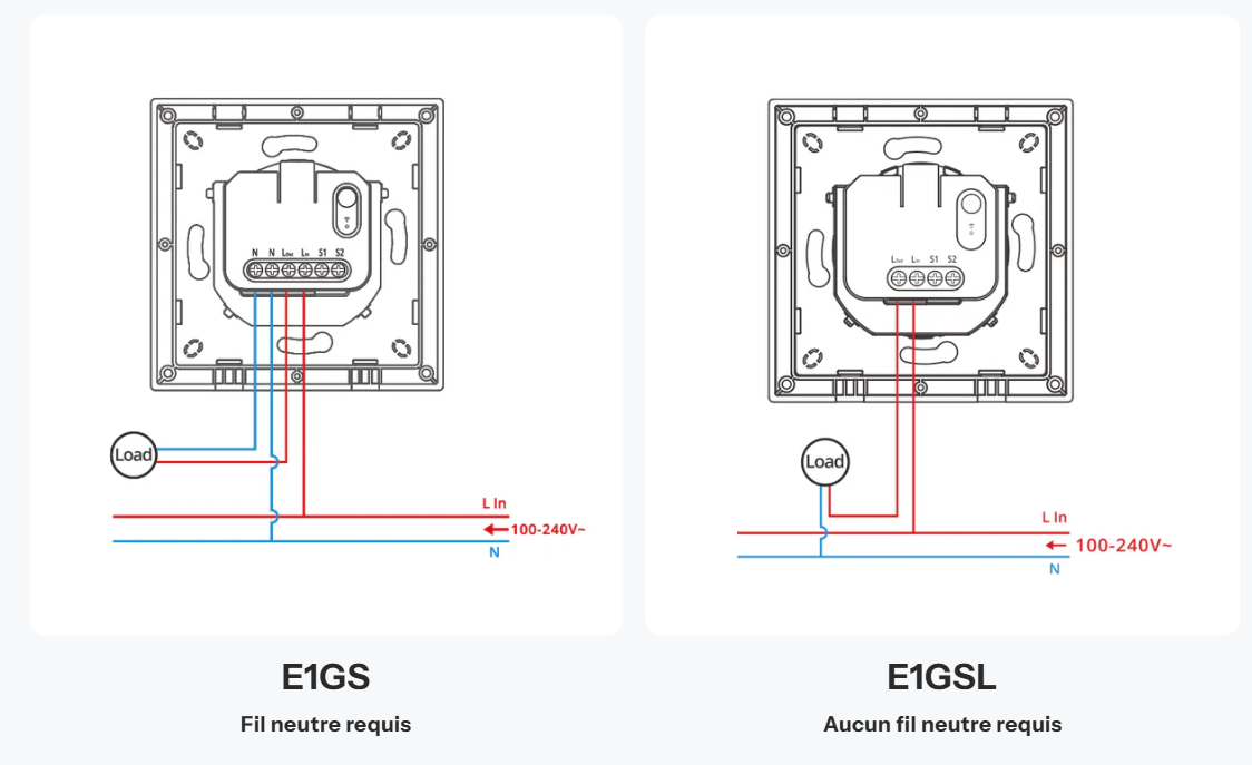 Diférents câblage selon le modèle, les 2 premiers pour l’éclairage avec ou sans neutre et le troisième pour les volets roulants.