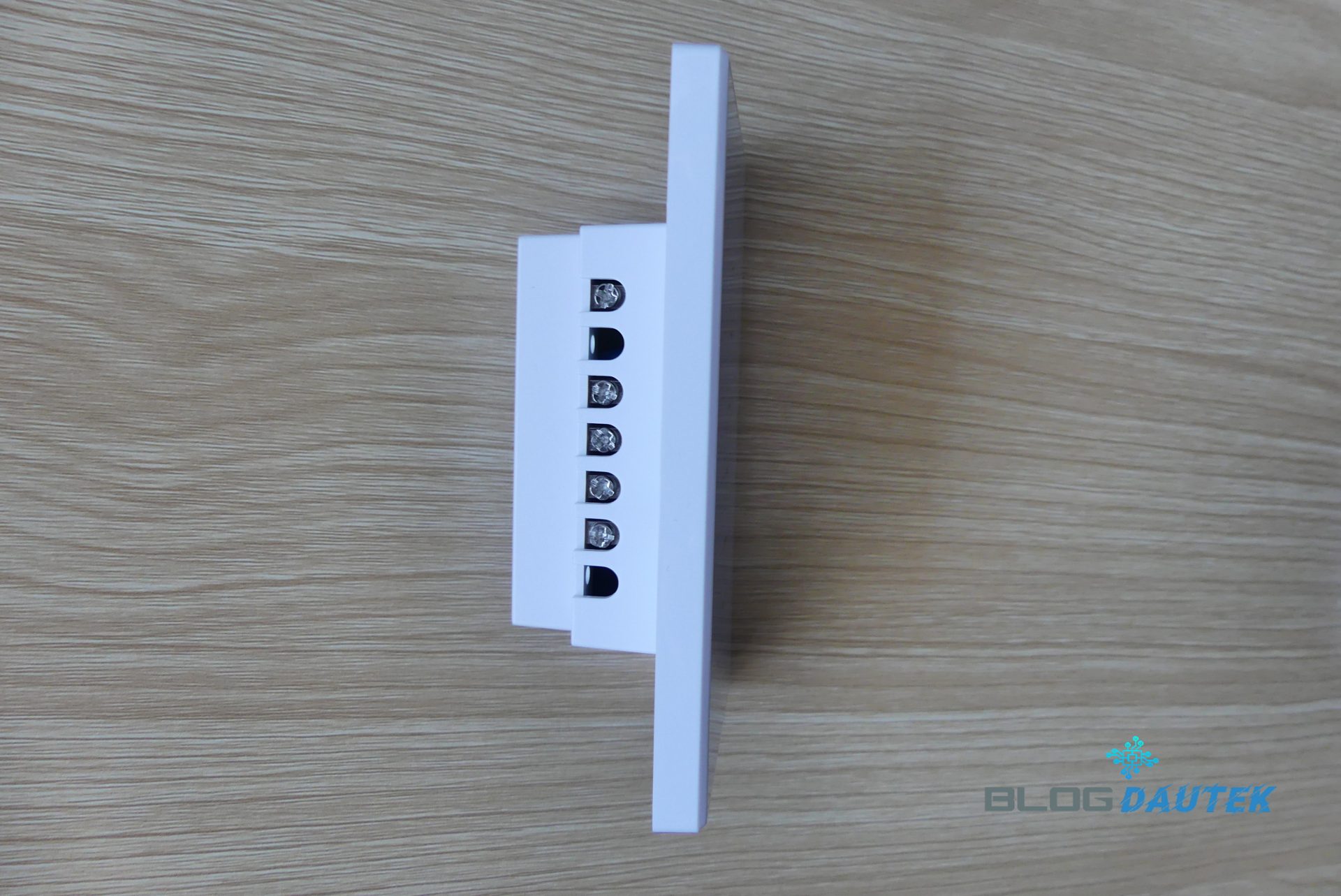 Vue de dos, avec QR code pour l’intégration Matter et le bornier de câblage à droite.