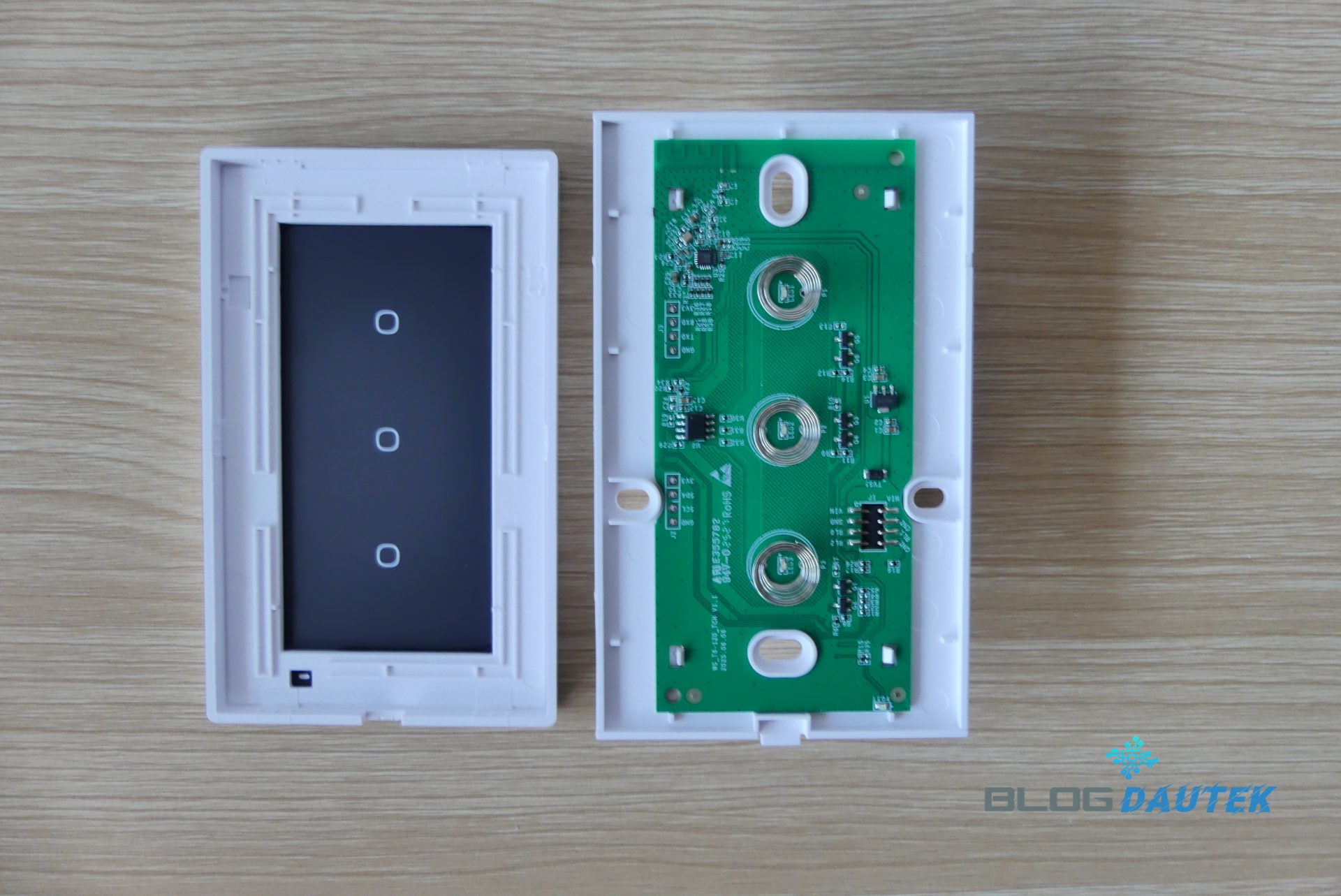 Déclipsage de la face avant pour permettre la fixation de la partie arrière et vu sur la platine électronique.