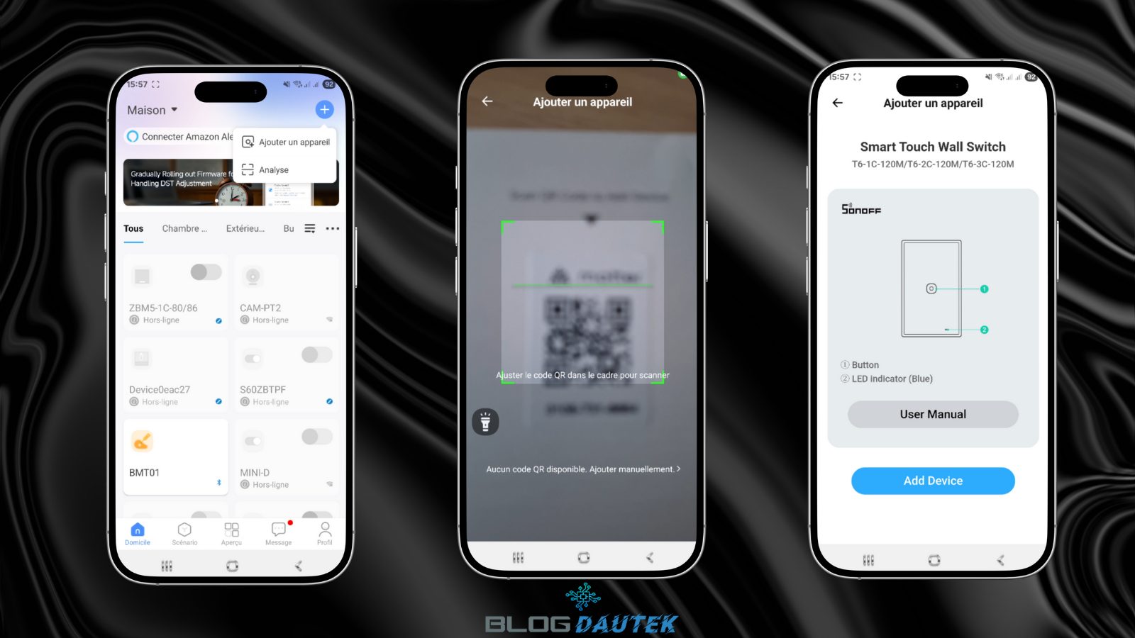 Pour configurer l’interrupteur Sonoff dans l’application, vous devez disposer d’un compte Ewelink. . Pour l’intégrer, cliquez sur le + en haut à droite puis, sur Analyse. Cliquez sur User Manuel pour accéder à la notice et sur Add Device pour commencer l’intégration.