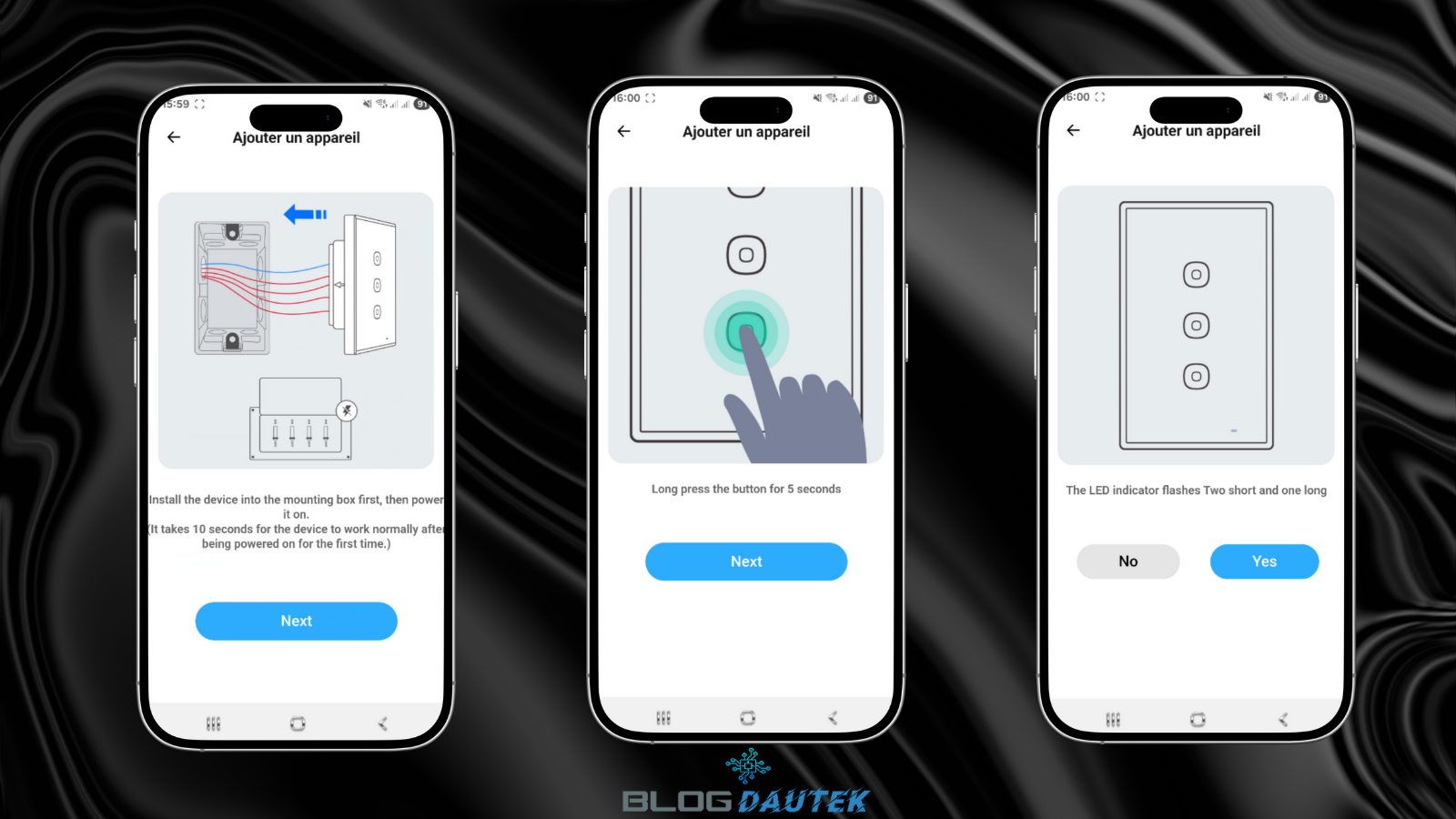 Ensuite, branchez l’interrupteur et cliquez sur Next. Appuyer 5 secondes sur le bouton du bas et cliquez à nouveau sur Next. Puis, si la LED bleu clignote en bas à droite de l’interrupteur, cliquez sur Yes.