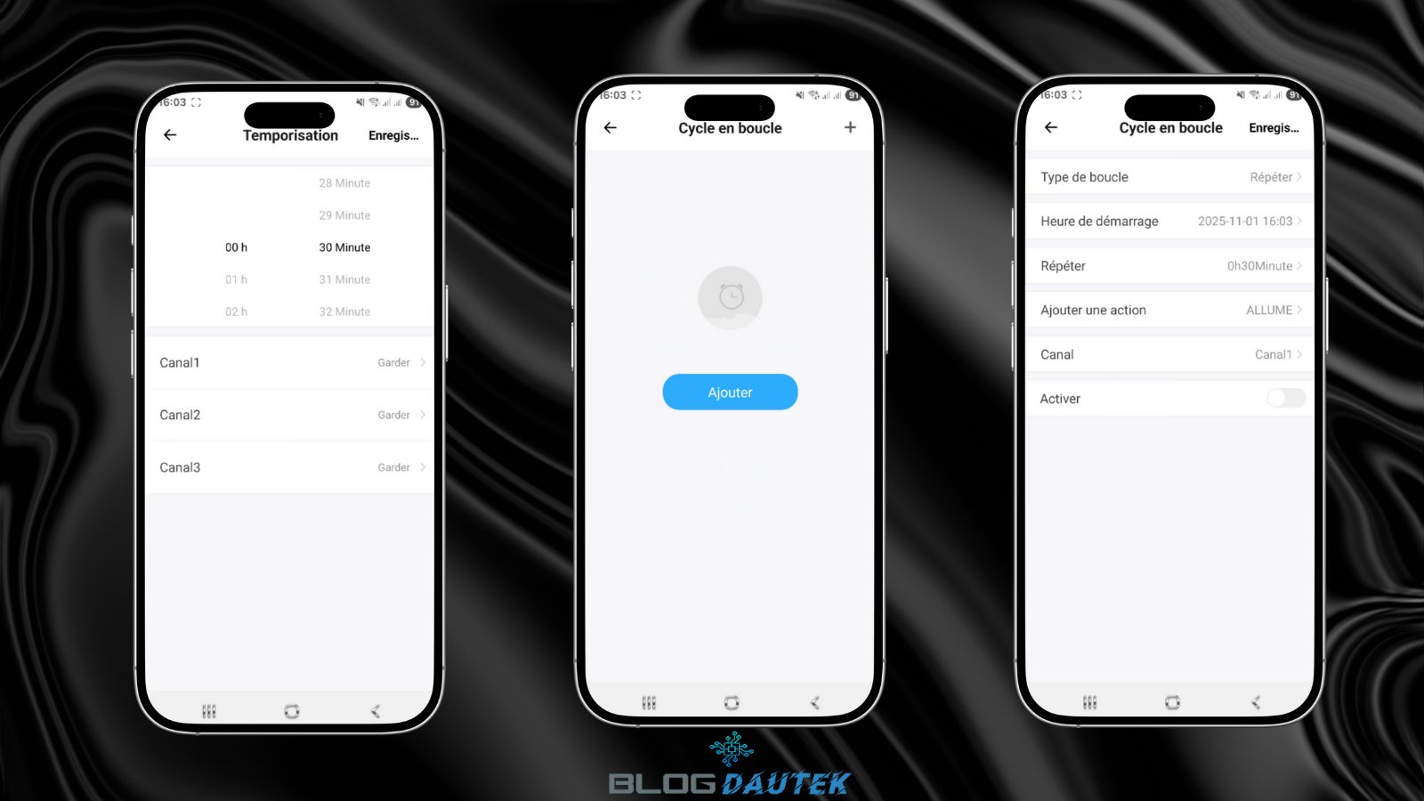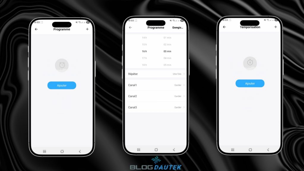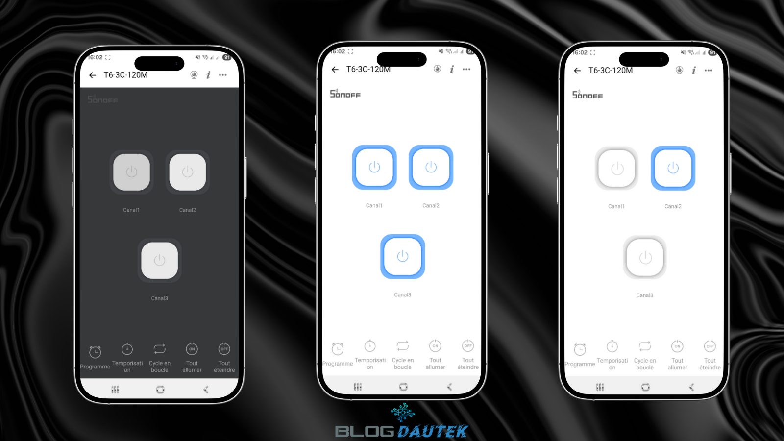 Enfin, en bas vous avez les onglets pour les programmes, les temporisations, les cycles en boucle et les boutons pour allumer ou éteindre les trois boutons en même temps.