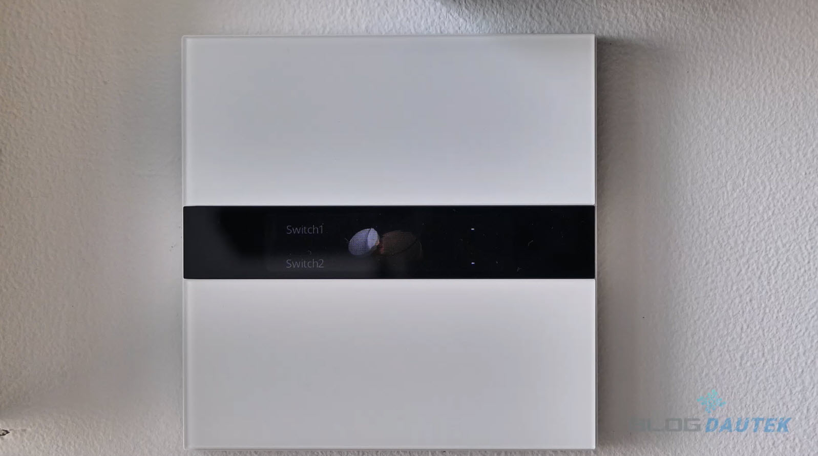 L’interface LCD permet de personnaliser l’étiquetage des boutons et de paramétrer des scènes. Les deux boutons de gauche servent de relais physiques pour contrôler directement une charge, tandis que les deux de droite sont sans fil pour déclencher des scènes ou commandes sur d’autres appareils.