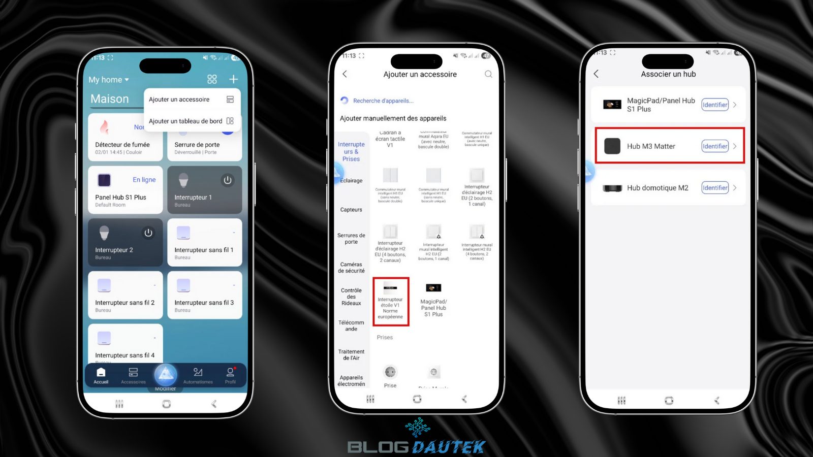 Maintenant, ouvrez l’application Aqara et cliquez sur + et Ajouter un accessoire. Cherchez l’interrupteur et cliquez dessus, puis, sélectionnez votre Hub Zigbee, pour ma part, le Hub M3 Matter.